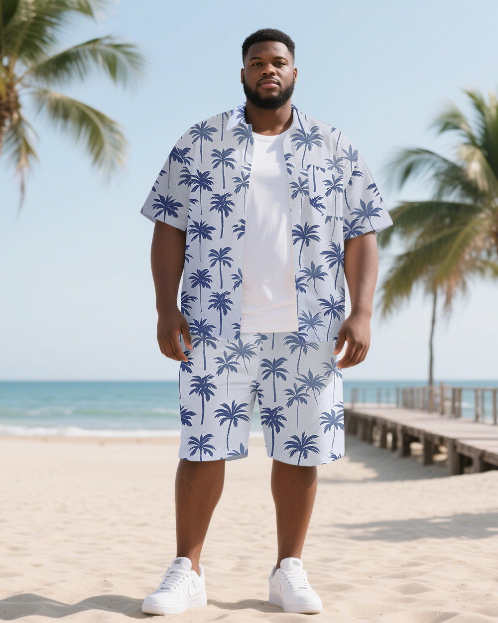 Men's Outdoor Hawaiian Style Coconut Trees Printed Big & Tall Short Sleeve Shirt Shorts 2-Piece Set