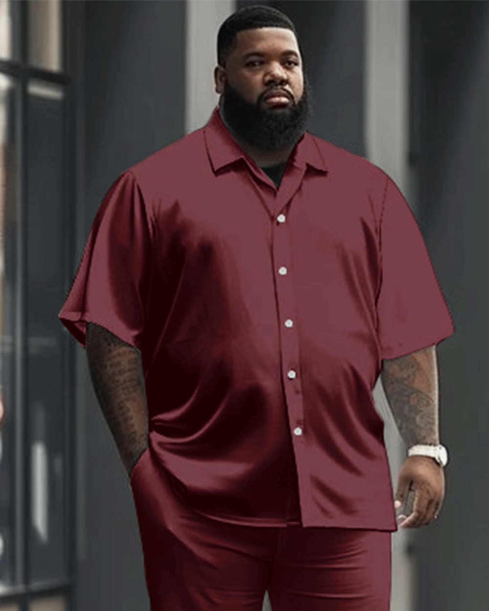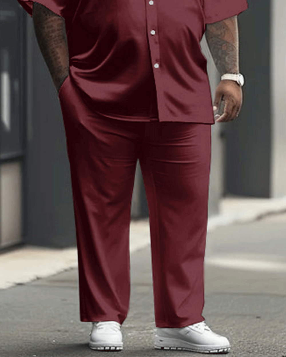 Men's Plus Size All-match Solid Color Burgundy Red Short-sleeved Shirt Trousers Suit