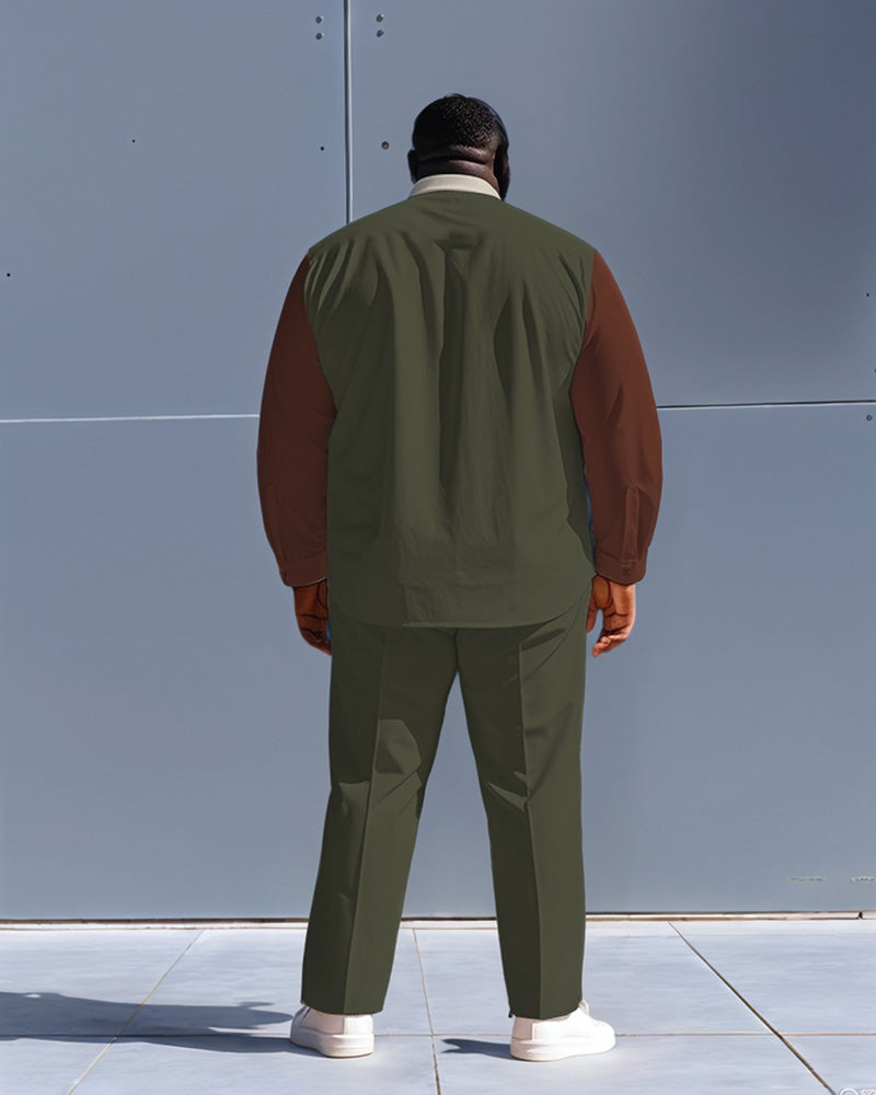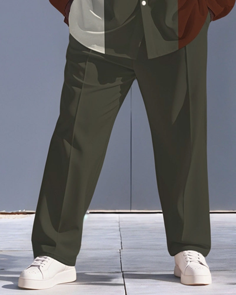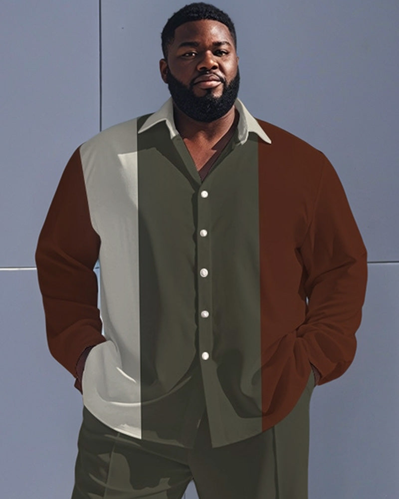 Men's Plus Size Army Green Brown Color-block Vertical Stripe Print Long Sleeve Shirt Trousers Suit