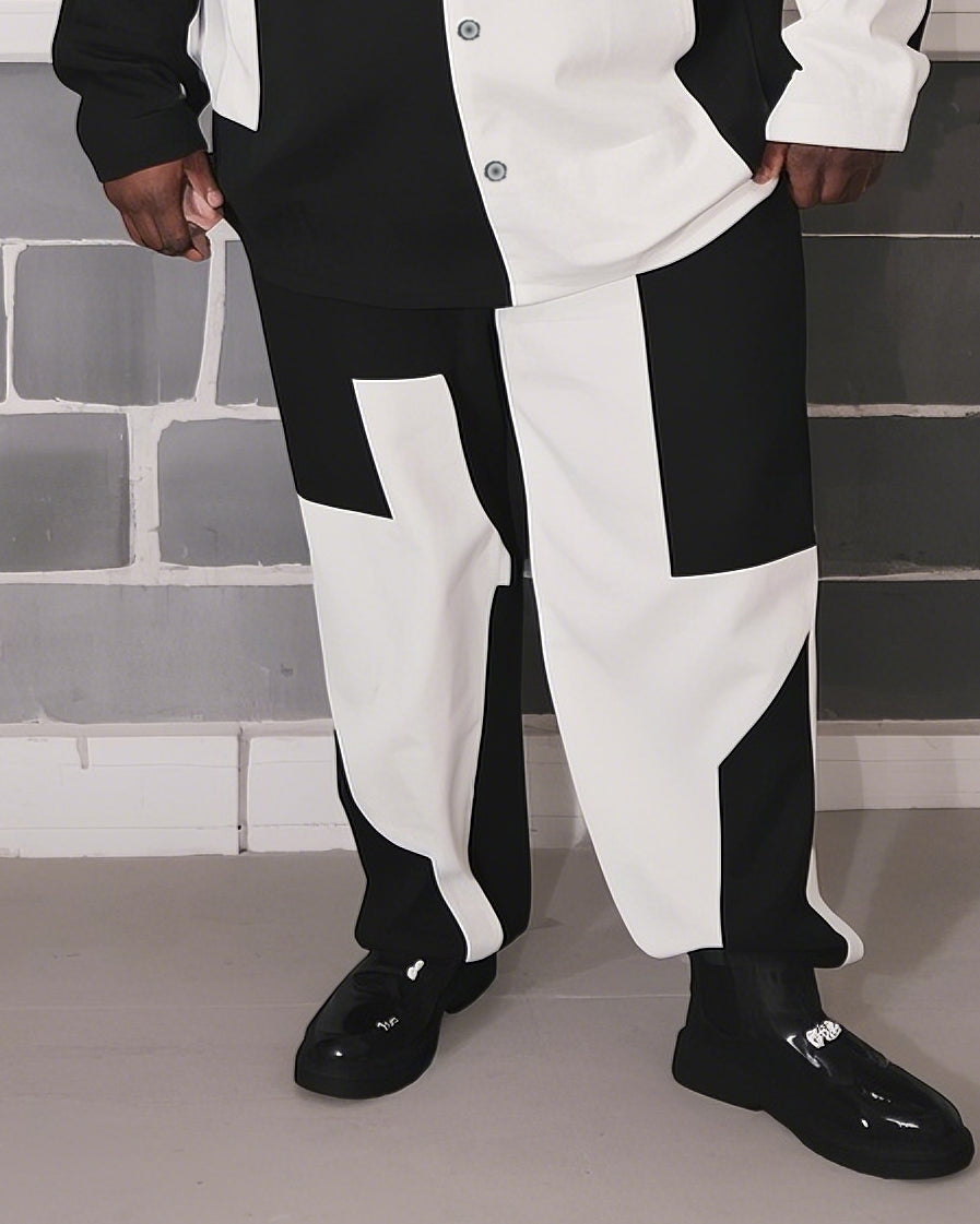 Men's Plus Size Black And White Colorblock Printed Long Sleeve Shirt Trousers Suit