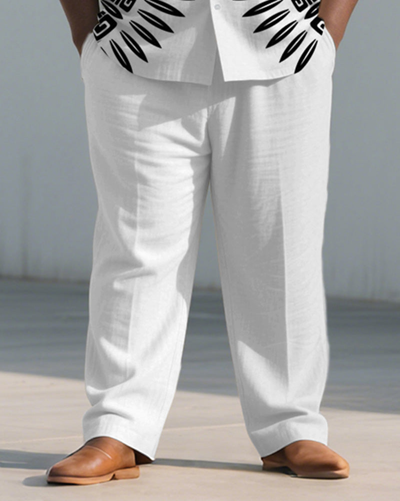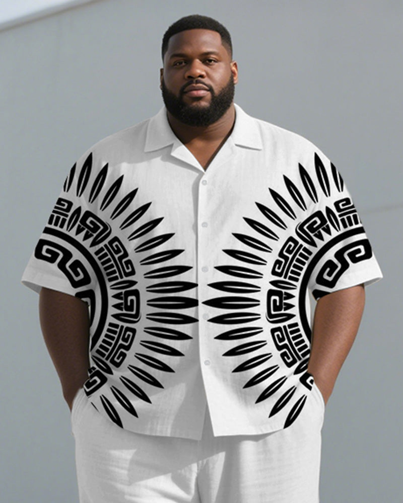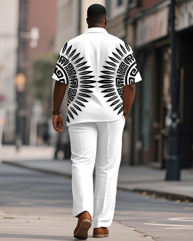 Men's Plus Size Black And White Geometric Print Short Sleeve Shirt Trousers Suit