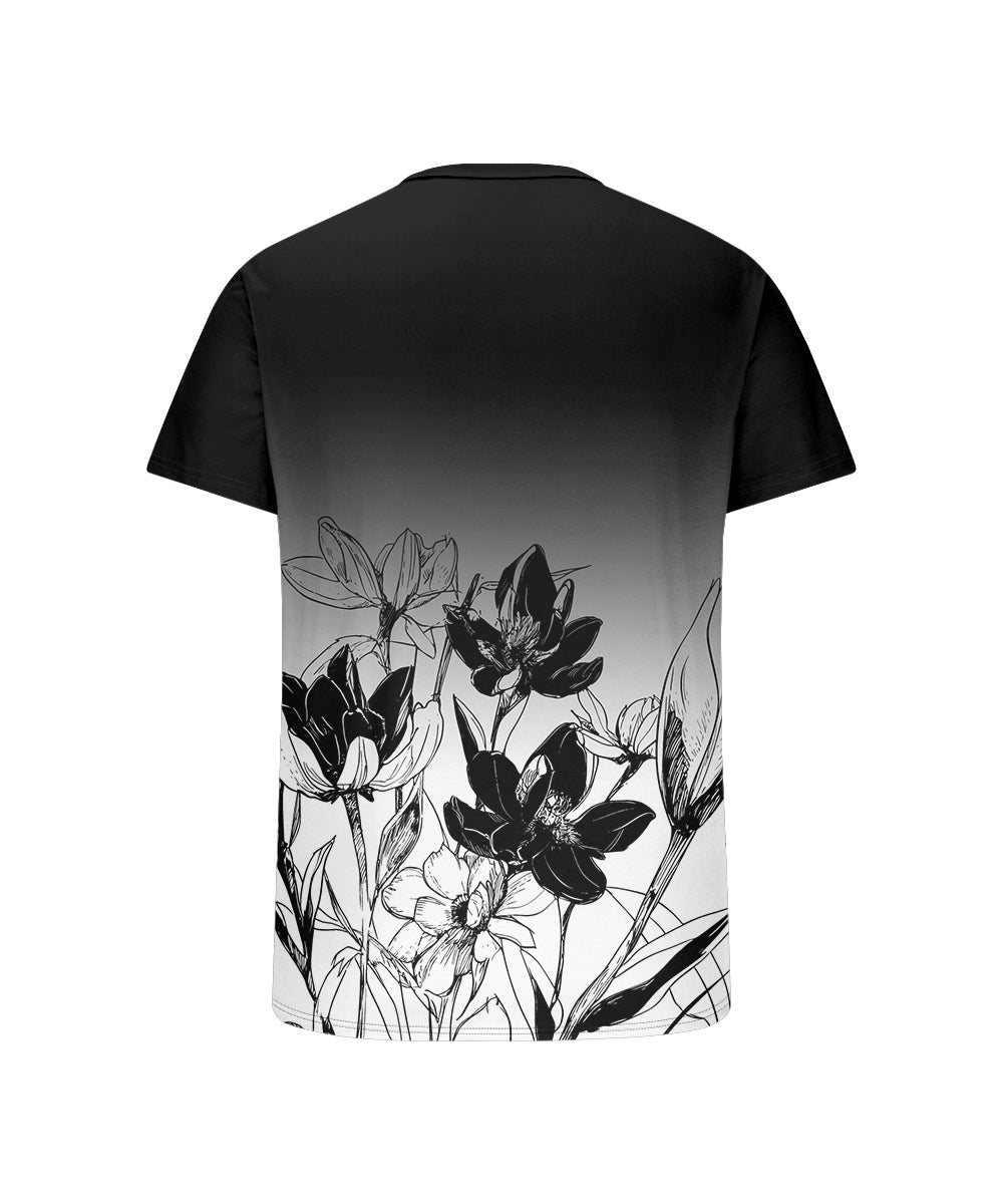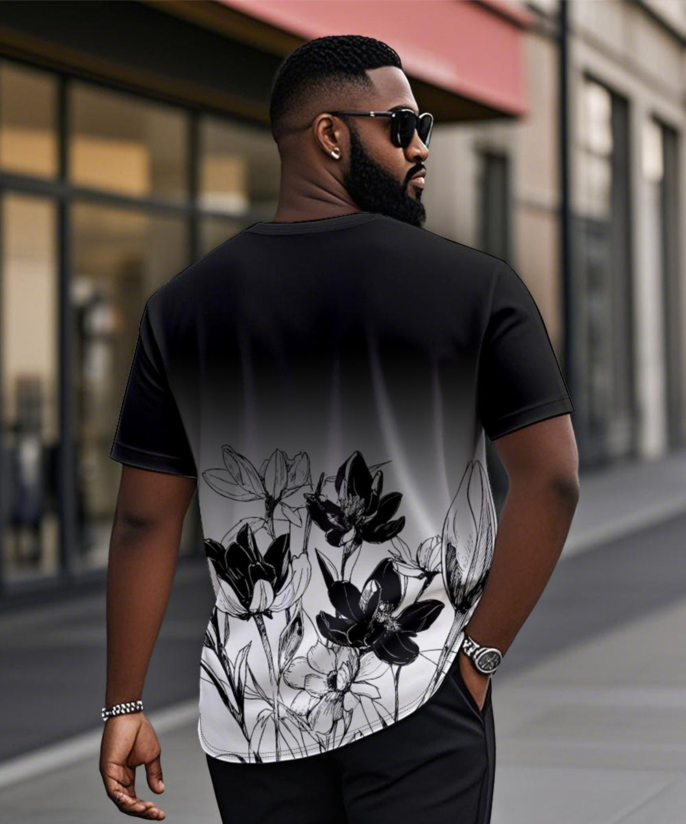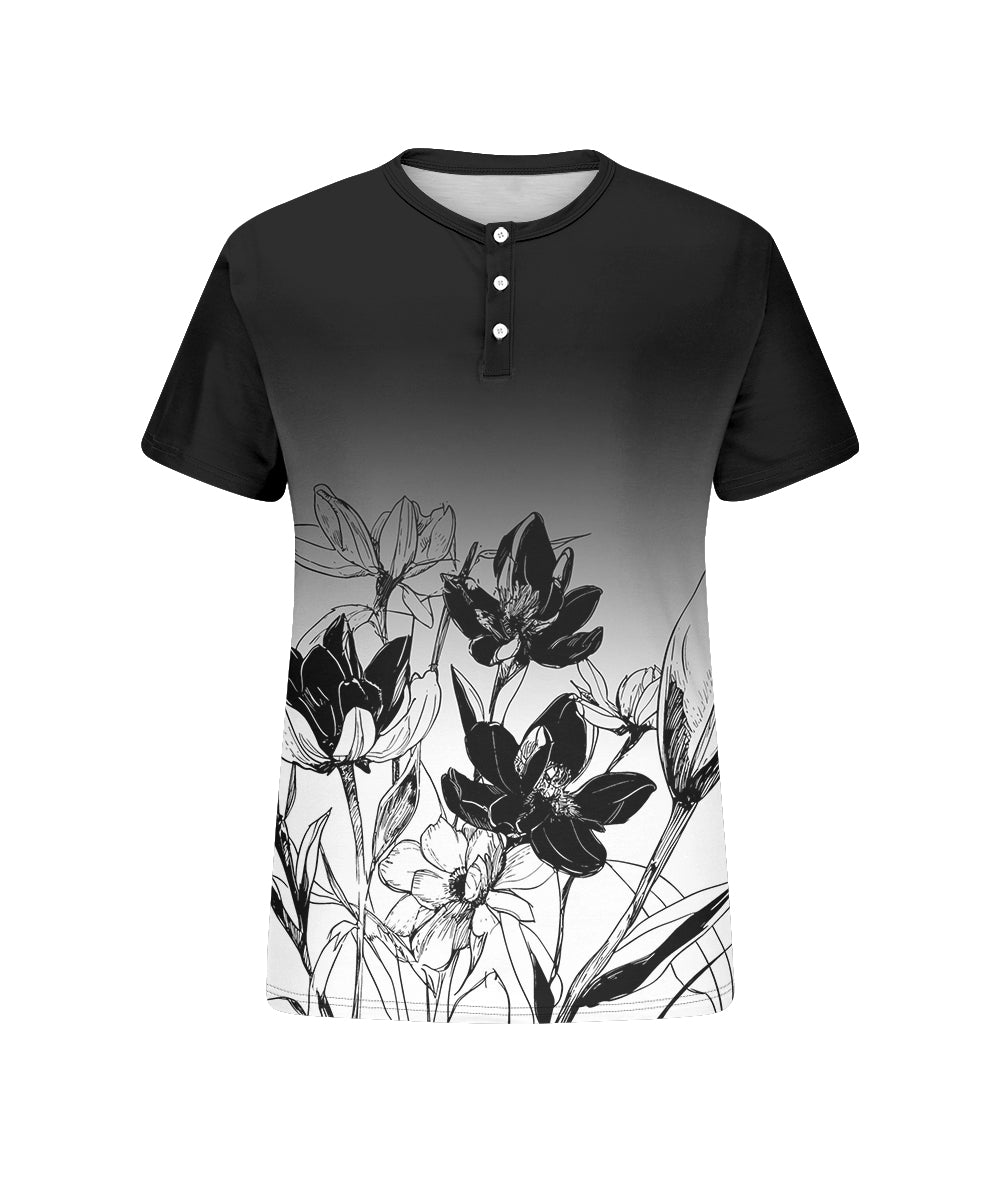 Men's Plus Size Black And White Gradient Floral Print Henry Collar Button Short Sleeve T-shirt
