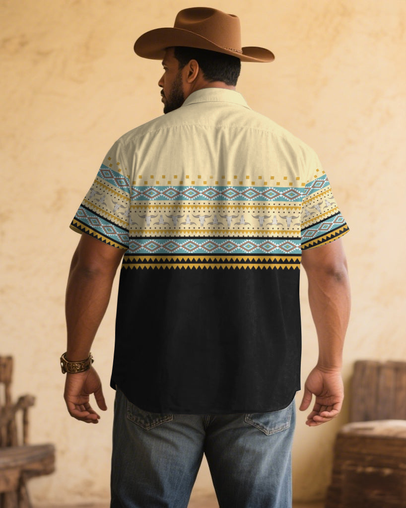 Men's Plus Size Black & Apricot Western Denim Cotton Blend Short Sleeve Shirt