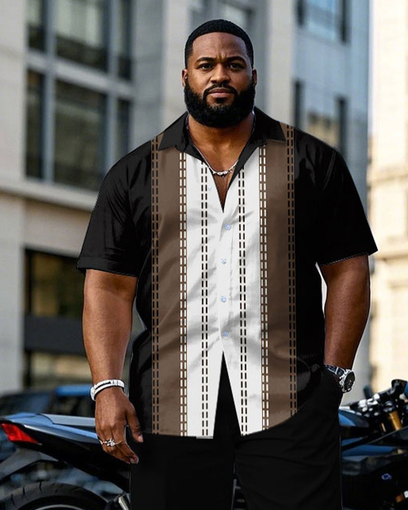 Men's Plus Size Black & Brown & White Stitching Top Line Sewing Short Sleeve Shirt Trousers Suit