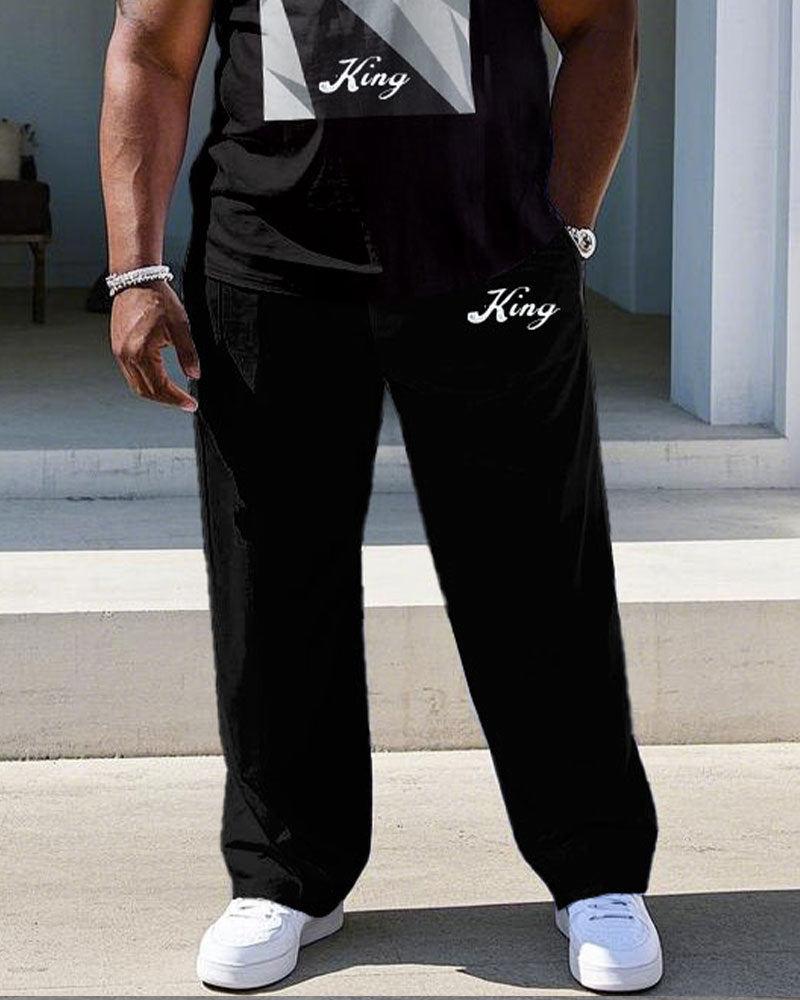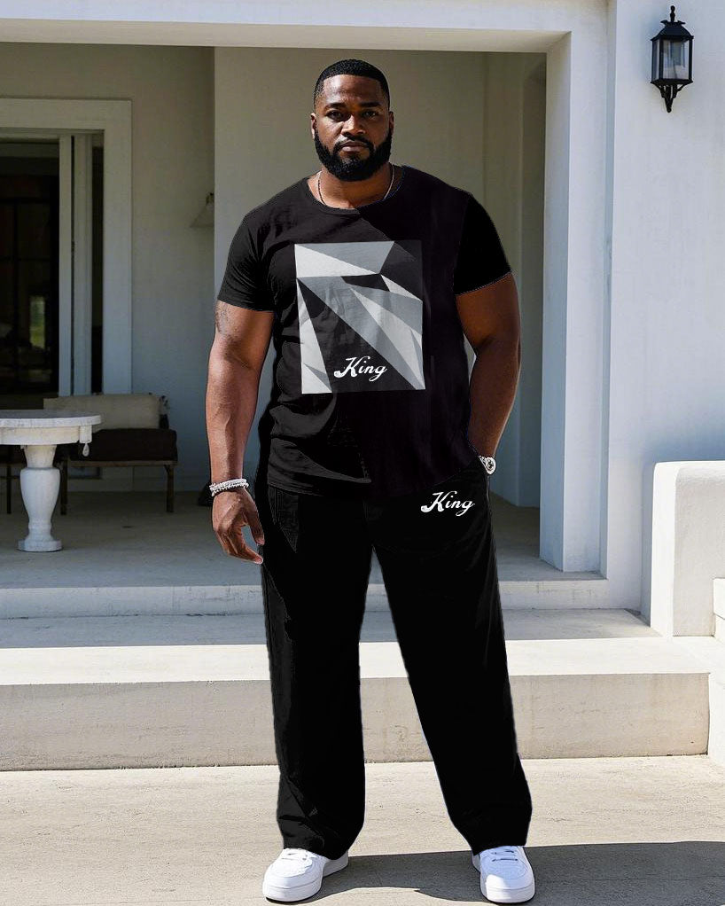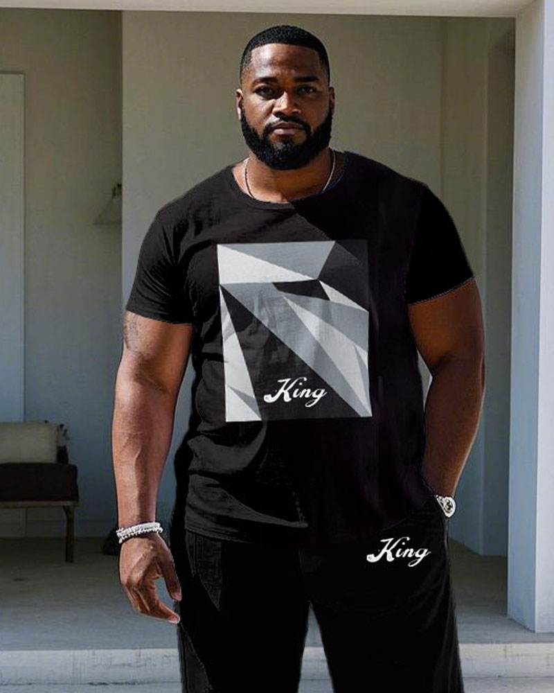 Men's Plus Size Black Chest Square Color Block Printed Short-sleeved T-shirt Trousers Suit