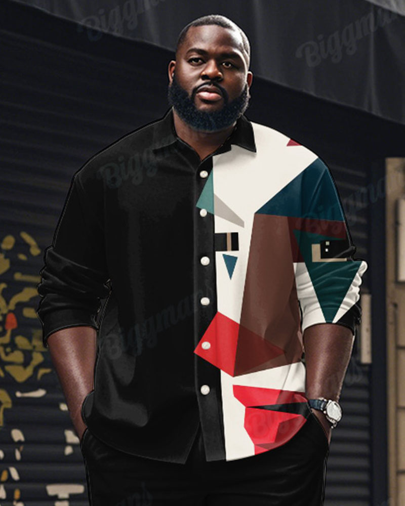 Designed for plus-size men, this classic black suit with individual colour blocking is a cool upgrade. On the long-sleeved shirt, the abstract clown cartoon print is eye-catching, artistic and witty, and the trendy atmosphere is full. Loose trousers cleverly cover meat, and the shirt tacitly matching, daily wear dashing casual, easy to highlight the unique charm.