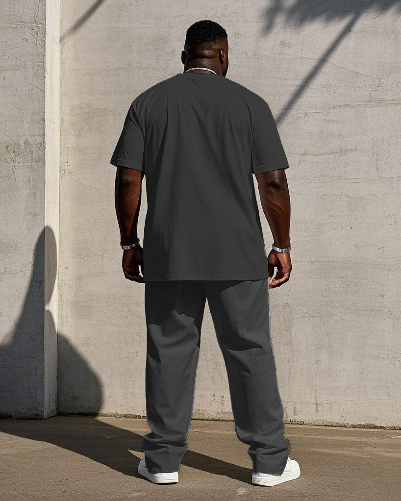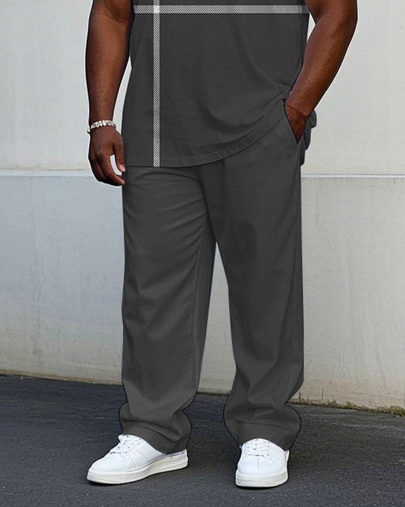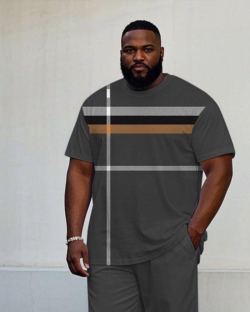 Men's Plus Size Black Gray Striped Stitching Printed Short Sleeve T-shirt Trousers Suit