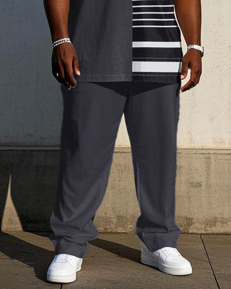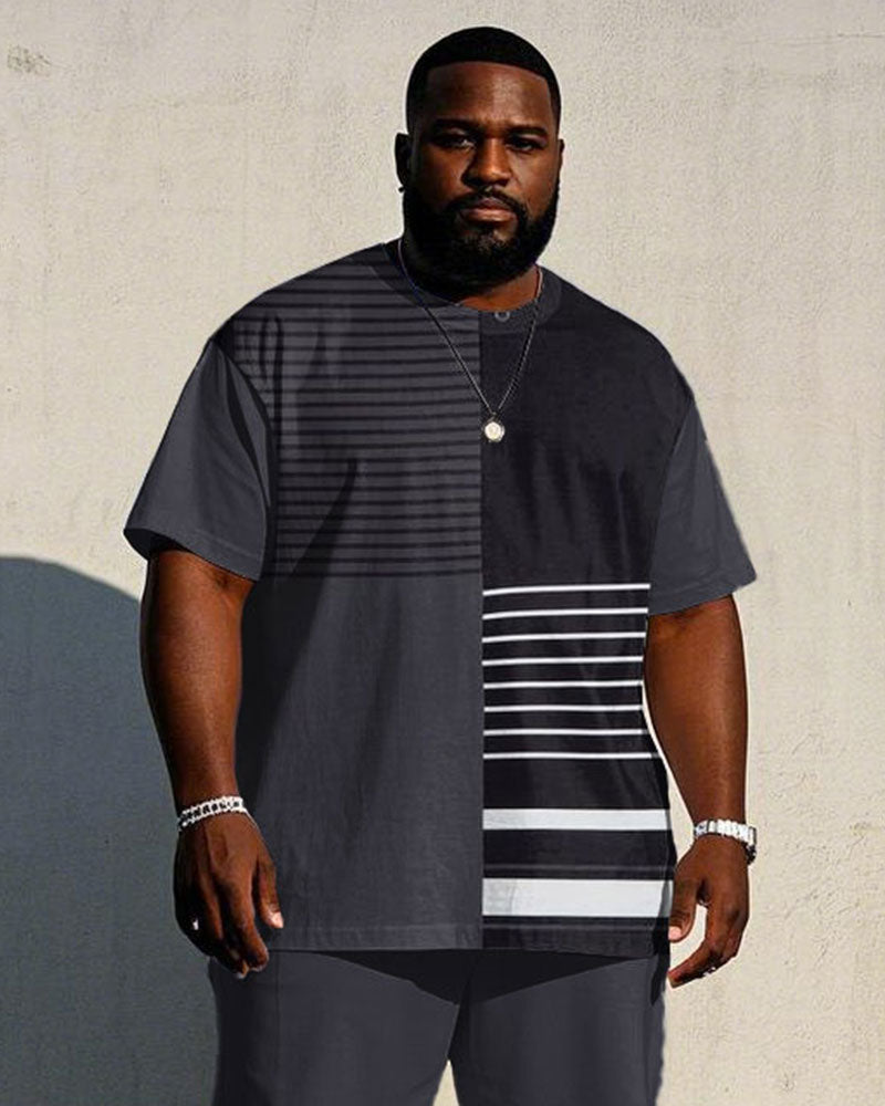 Men's Plus Size Black Gray Striped Stitching Printed Short Sleeve T-shirt Trousers Suit