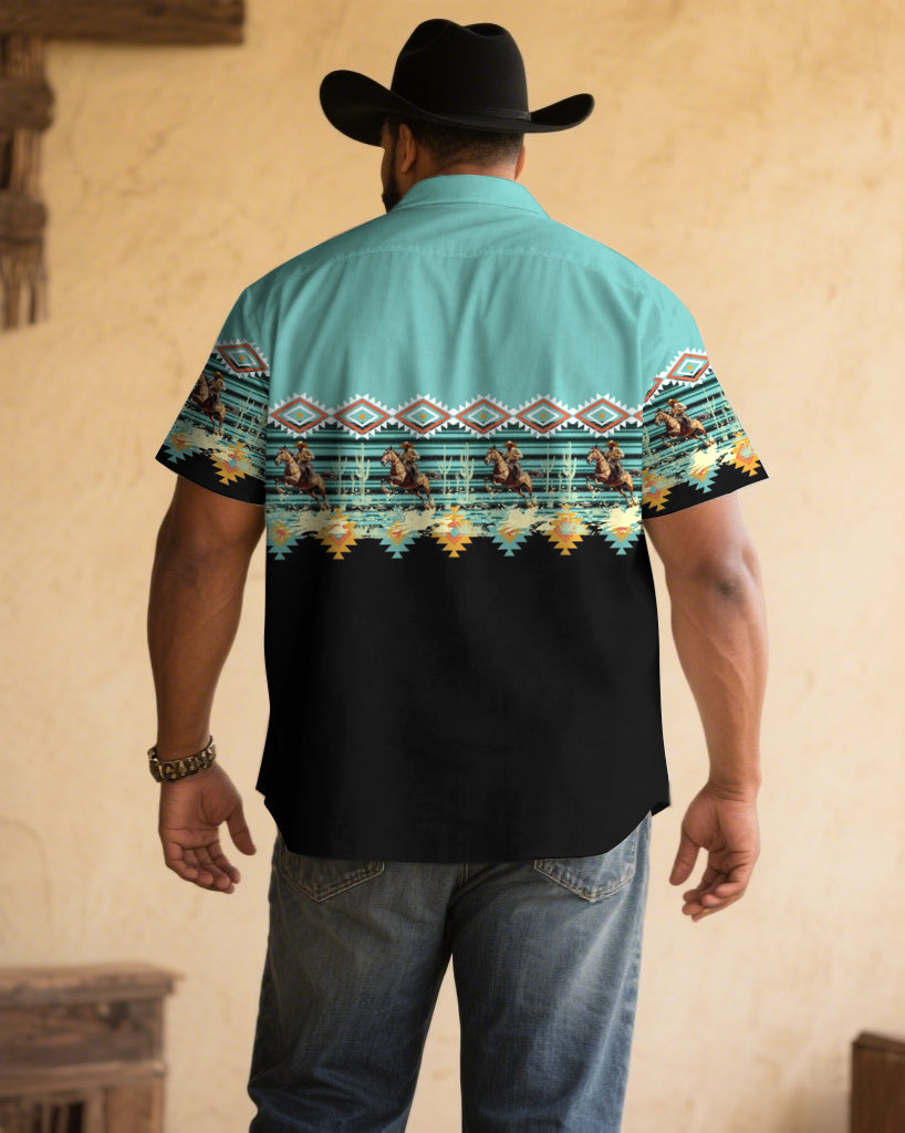 Men's Plus Size Black & Green Western Denim Floral Print Short Sleeve Shirt