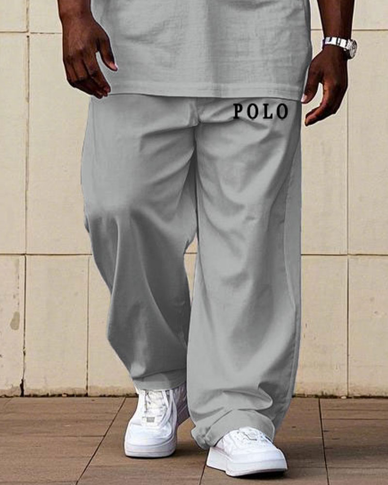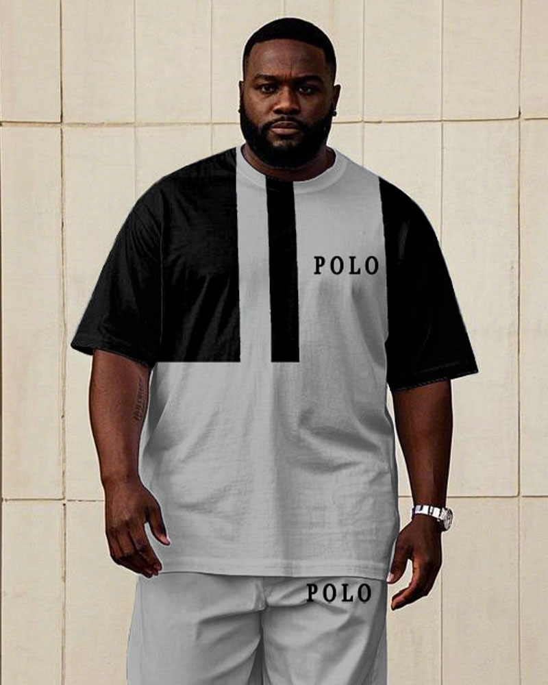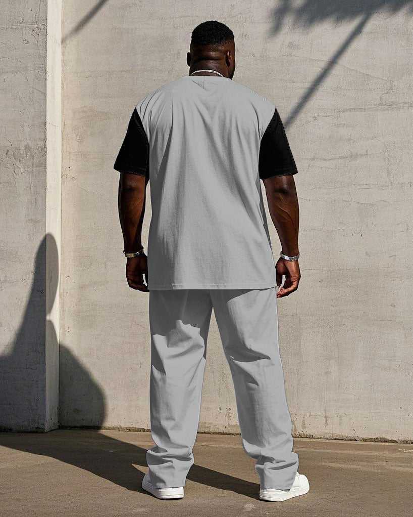 Men's Plus Size Black & Grey Colorblock Logo Print Short Sleeve T-Shirt Trousers Suit