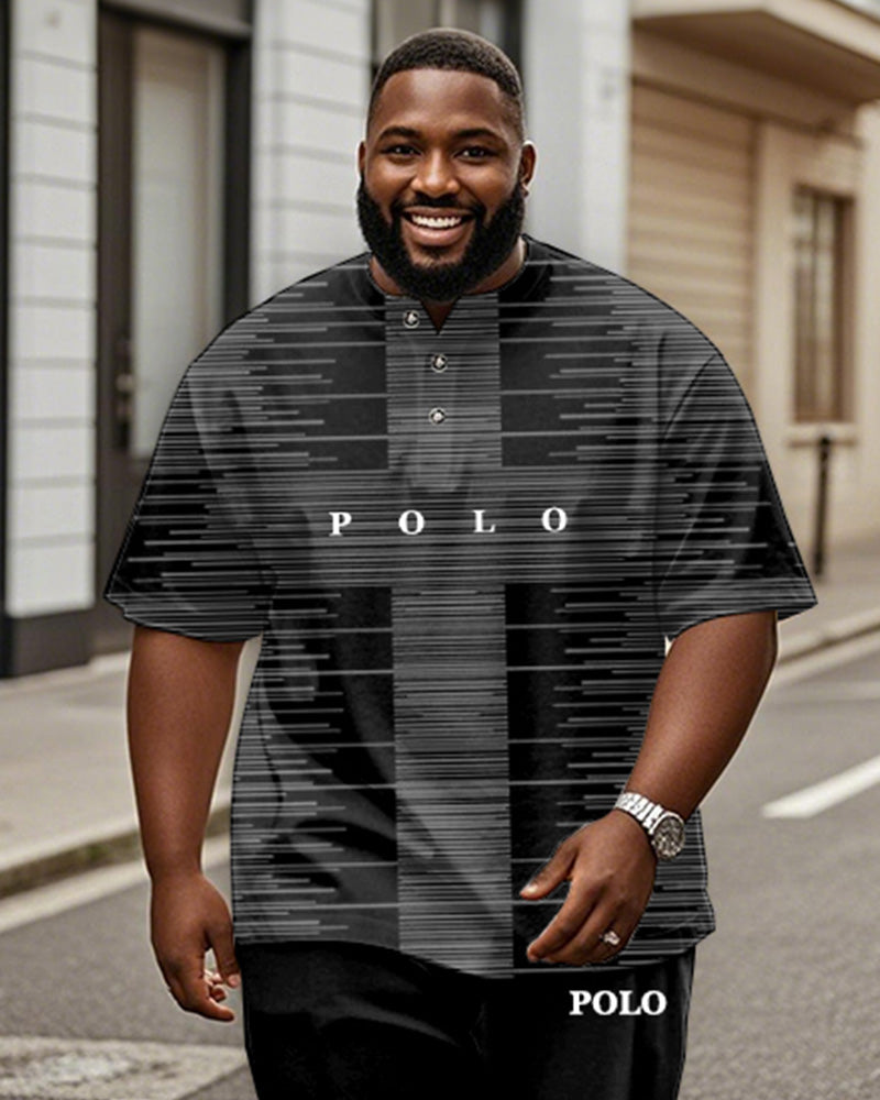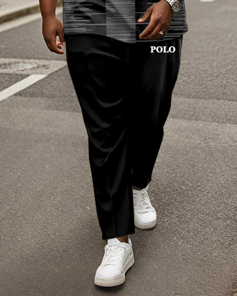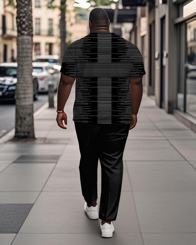 Men's Plus Size Black Grey Stripe Colorblock Alphabet Print Henry Collar T-Shirt Trousers Suit