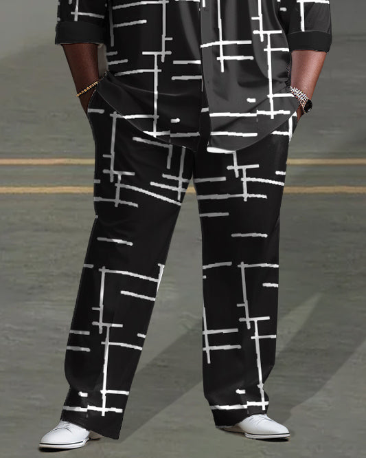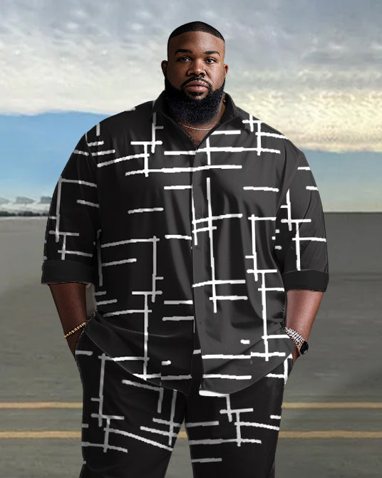 Men's Plus Size Black Irregular Geometric Line Long Sleeve Lapel 2 Shirt Set