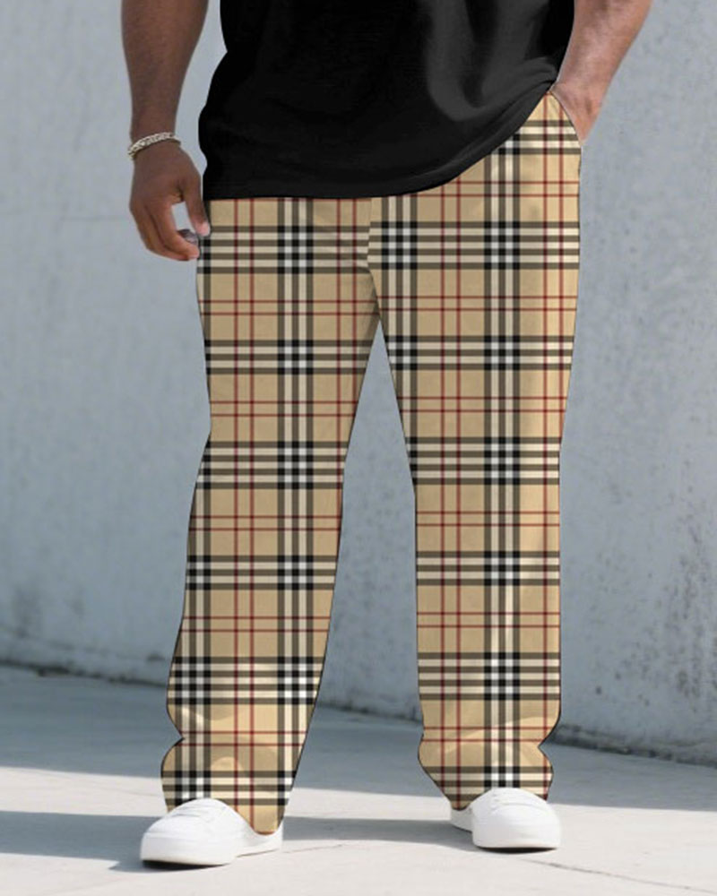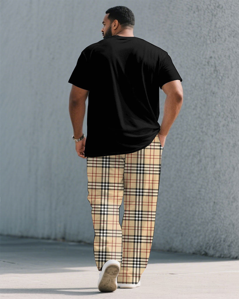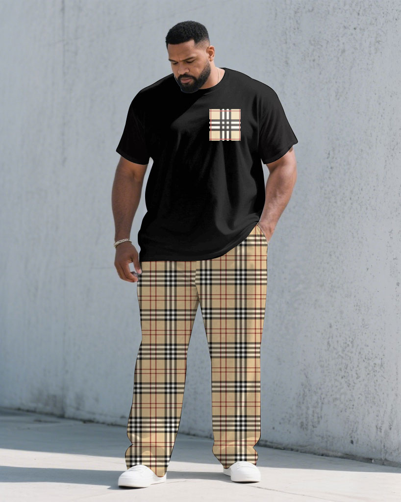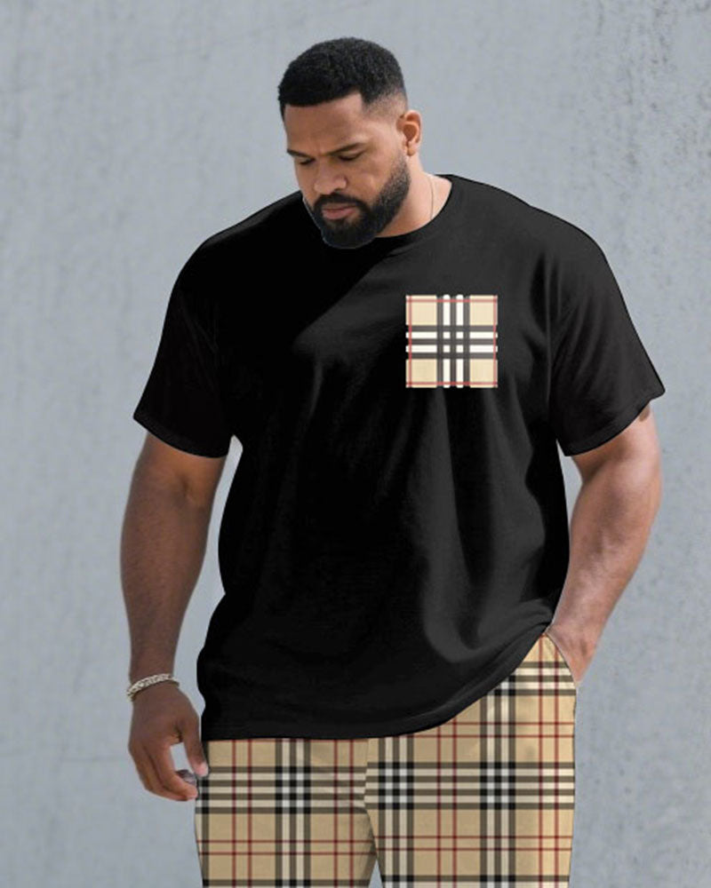 Men's Plus Size Black & Khaki Plaid Chest Pocket Printed Short-sleeved T-shirt Trousers Suit