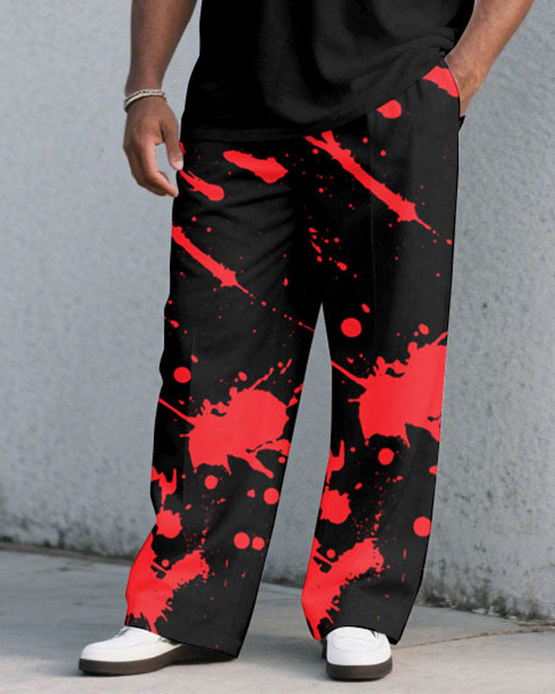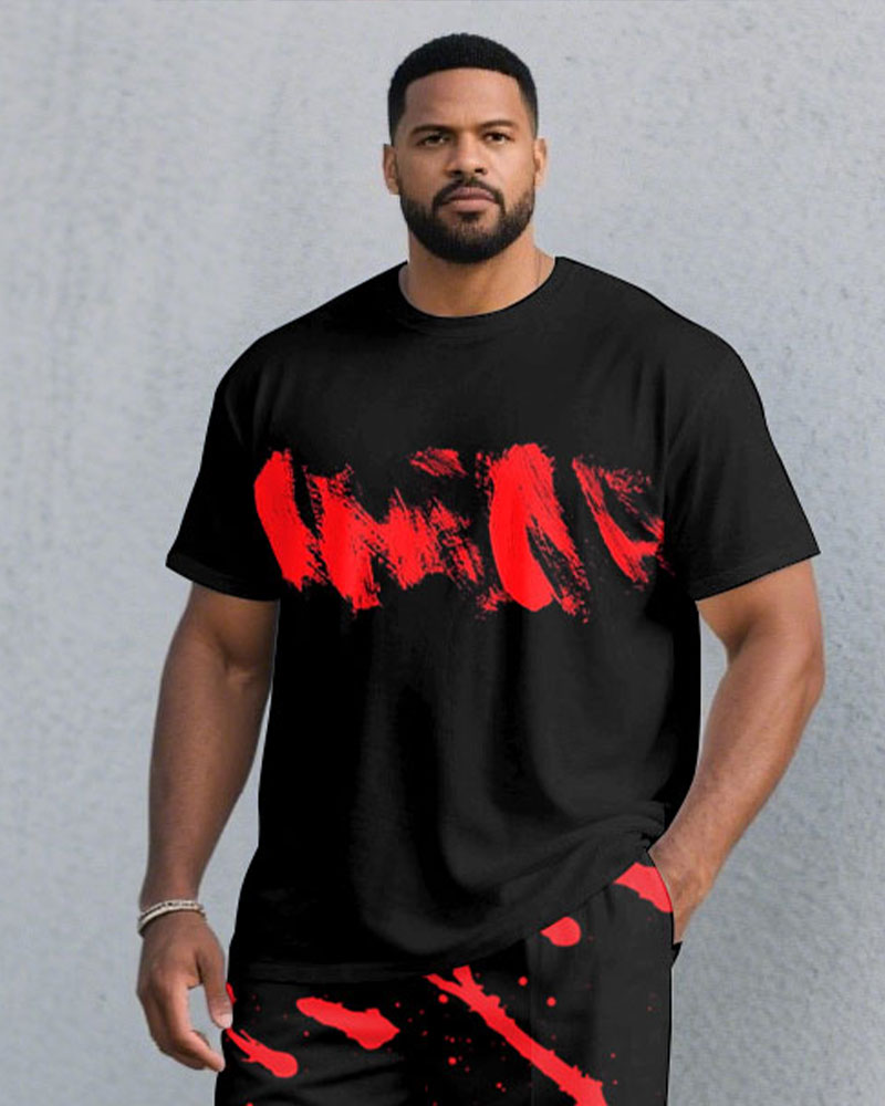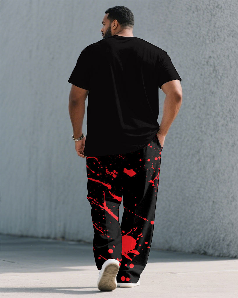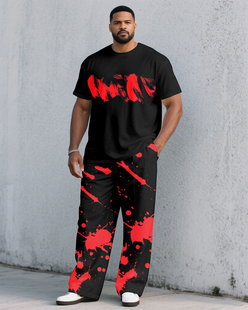 Men's Plus Size Black & Red Ink-throwing Short-sleeved T-shirt Pants Suit