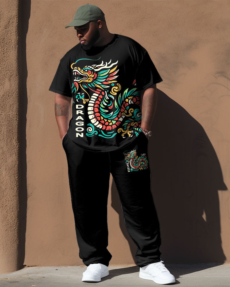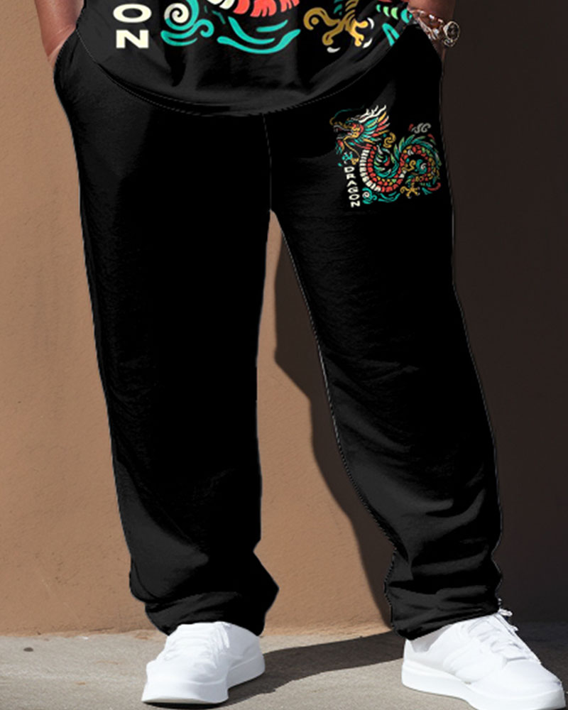 Men's Plus Size Black Vintage Dragon Totem Print T-Shirt Trousers Suit
