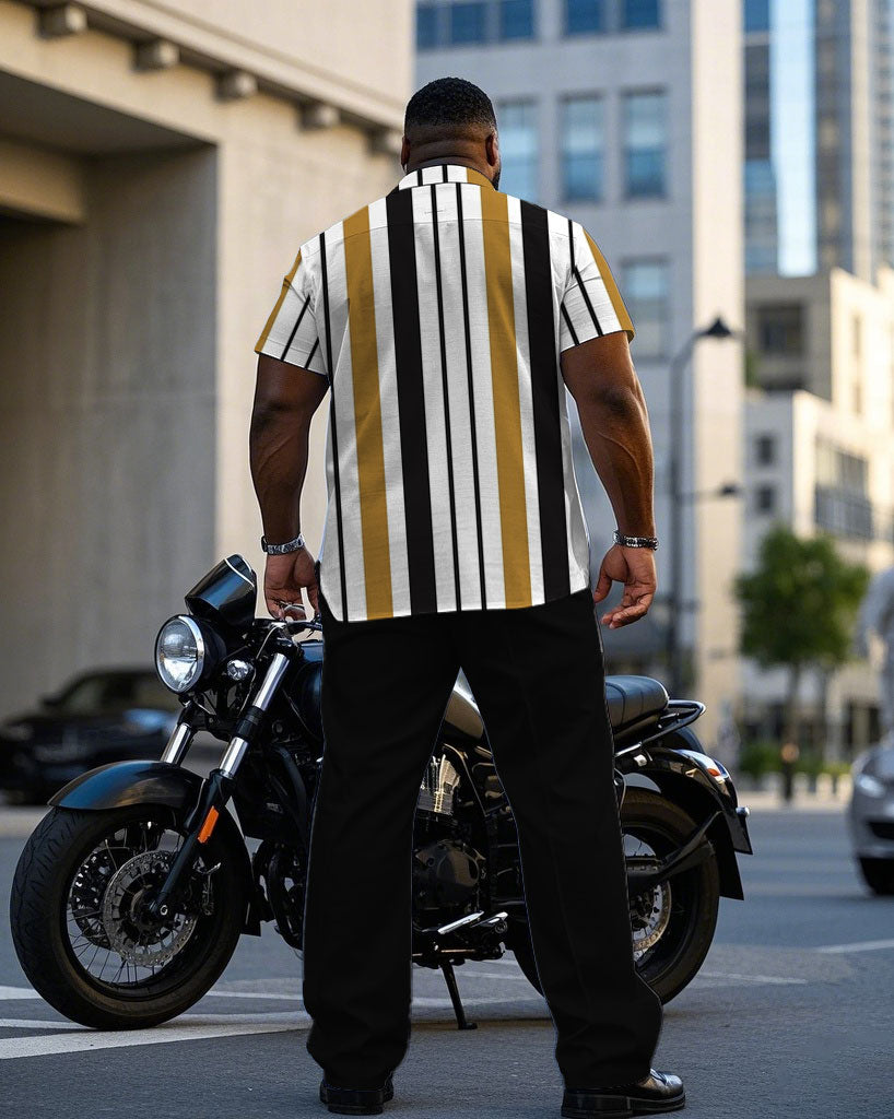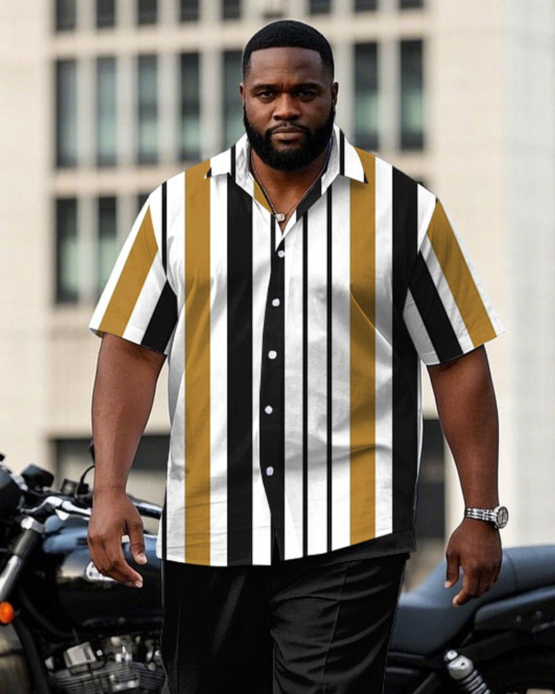 Men's Plus Size Black & White & Khaki Striped Short Sleeve Shirt Trousers Suit