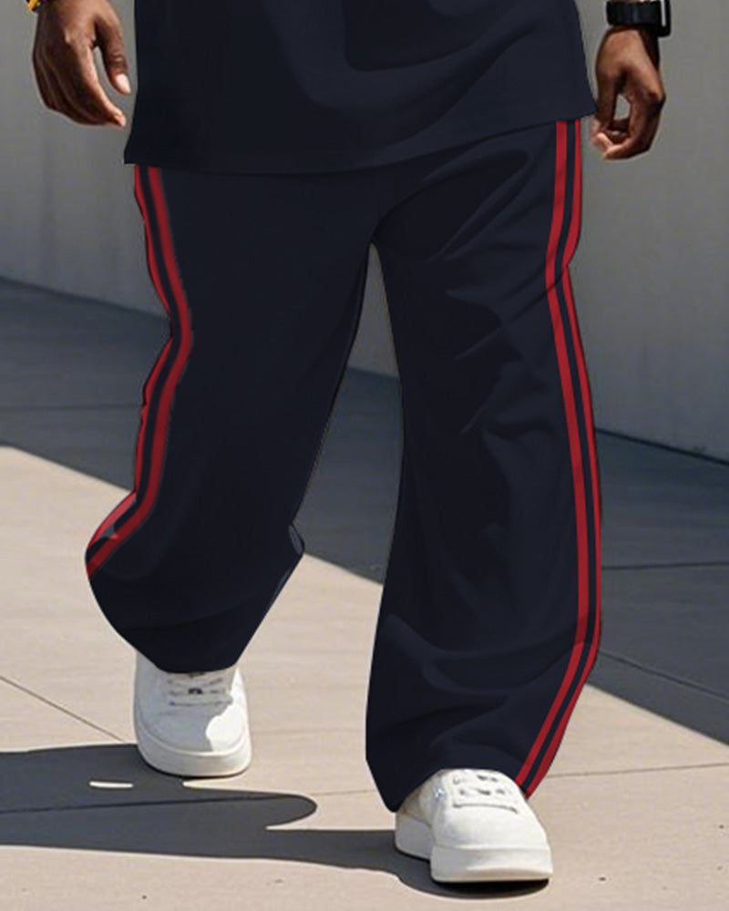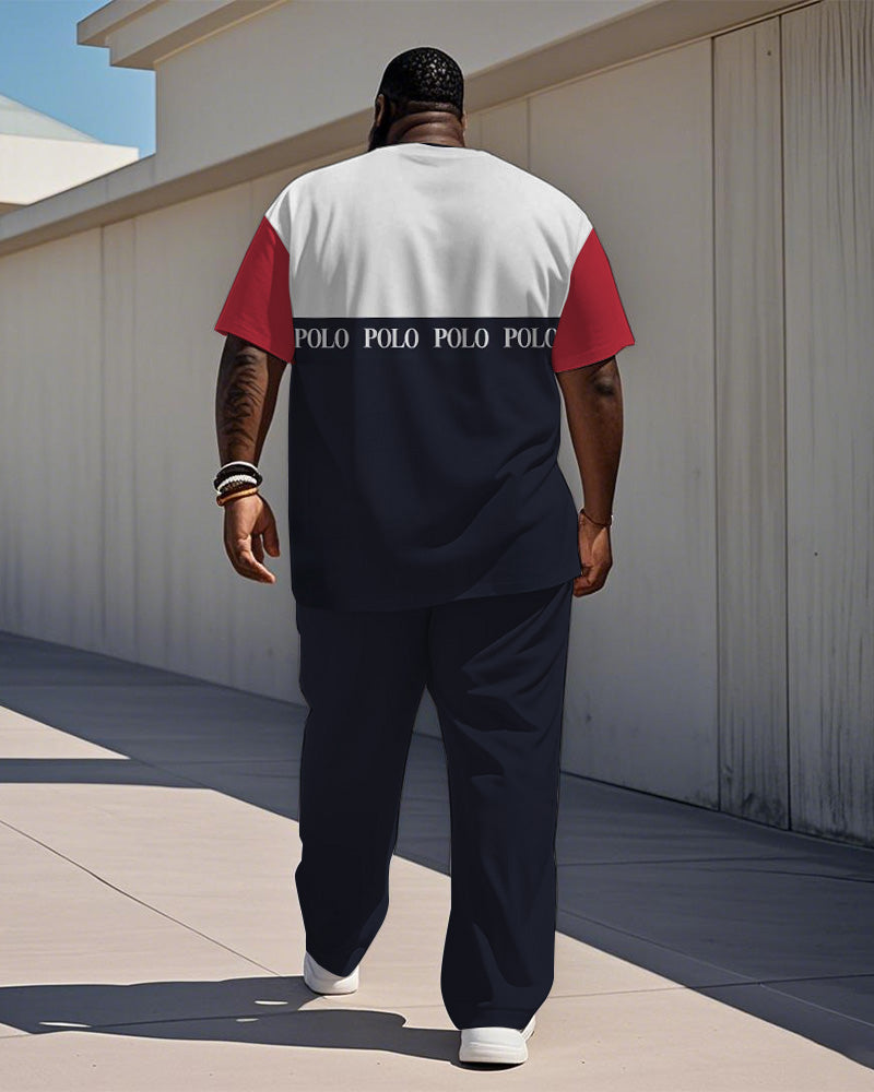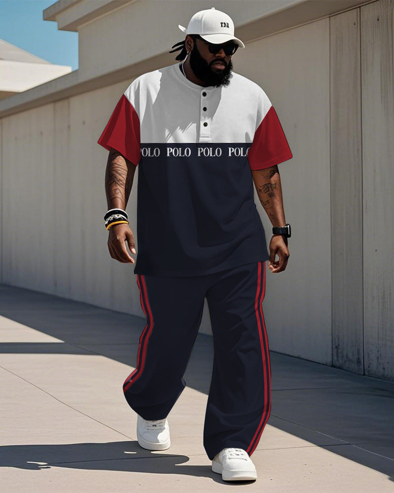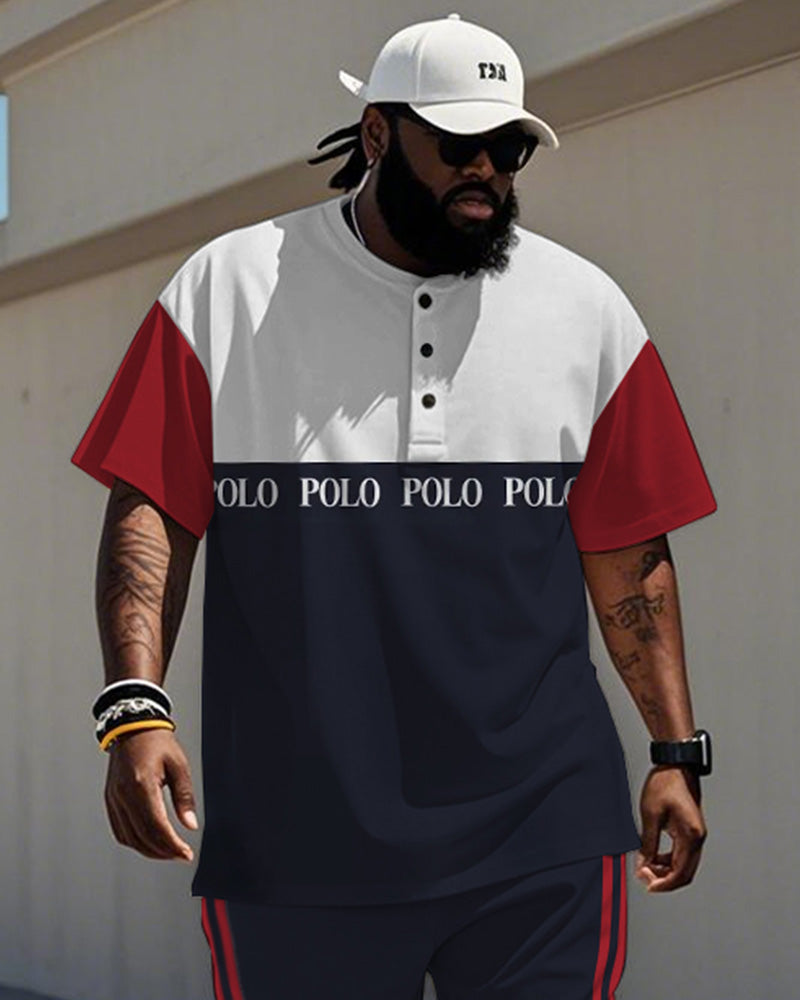 Men's Plus Size Blue And Red Color-block Alphabet Print Henry Collar T-shirt Trousers Suit