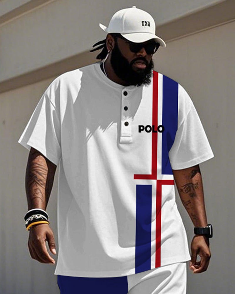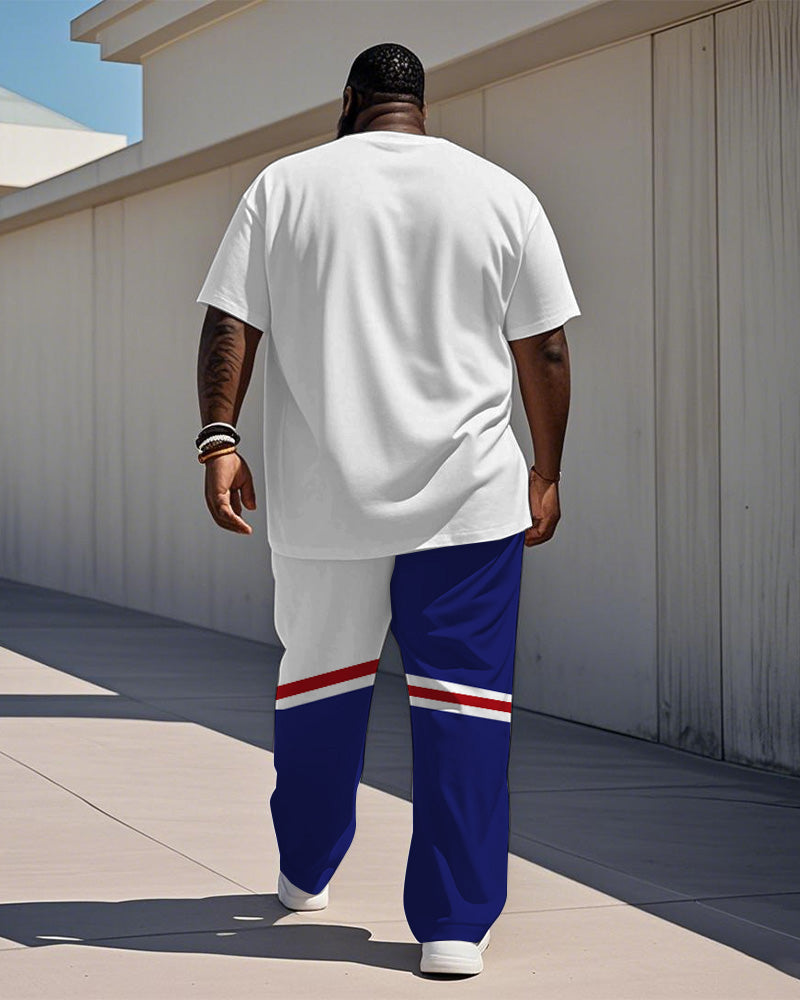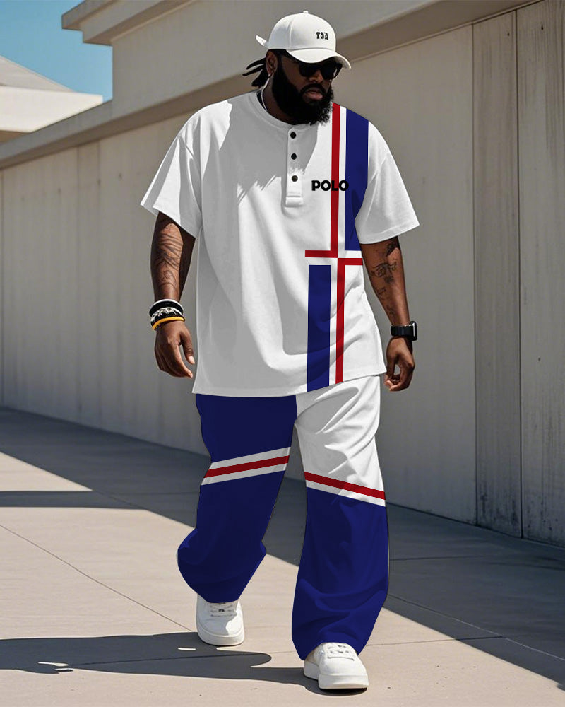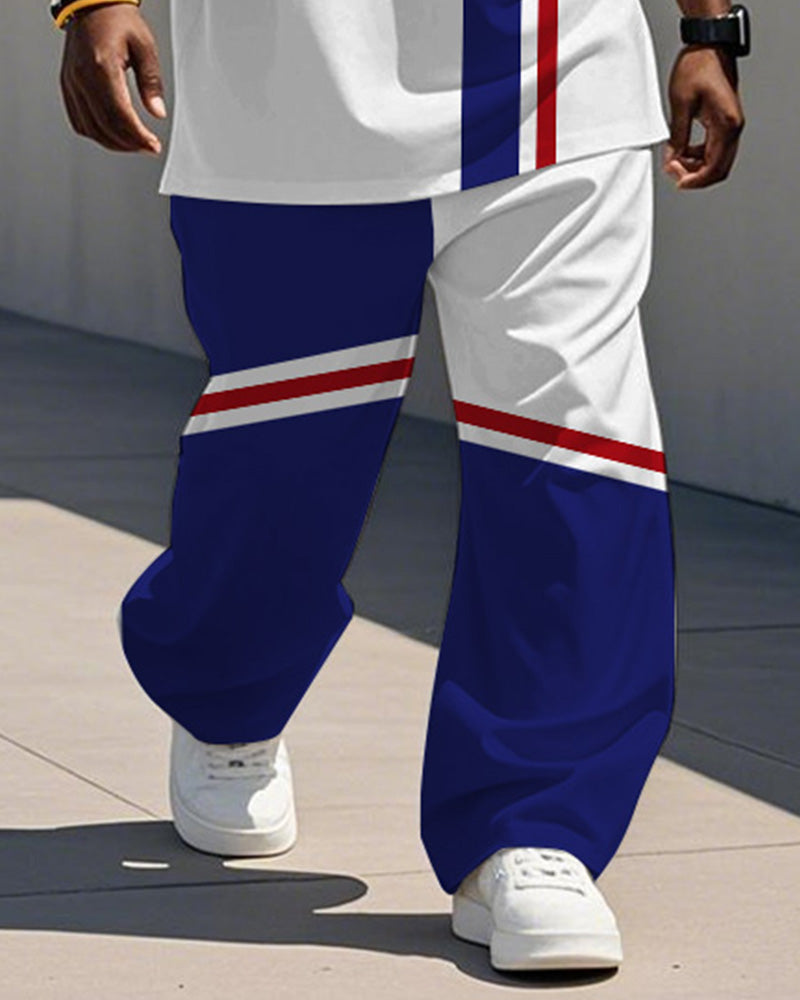 Men's Plus Size Blue And Red Stripe Colorblock Alphabet Print Henry Collar T-Shirt Trousers Suit