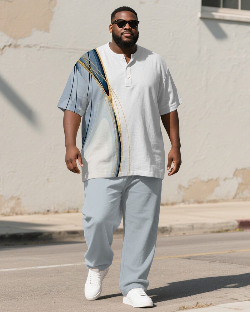 Men's Plus Size Blue And White Color-block Gradient Line Print Henry Collar T-shirt Trousers Suit