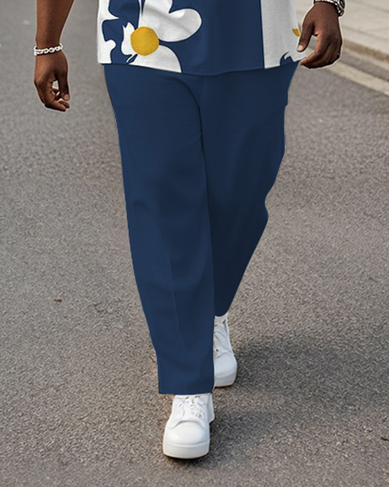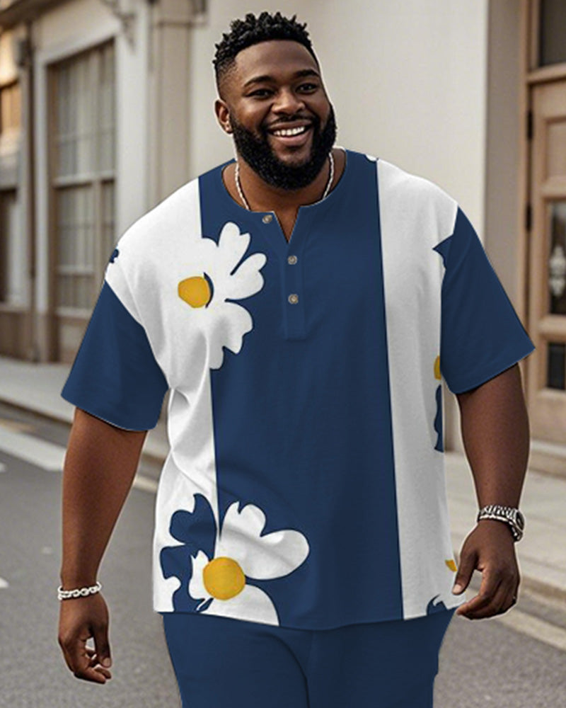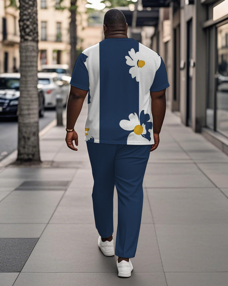 Men's Plus Size Blue And White Flower Colorblock Stripe Geometric Print Henry Collar T-Shirt Trousers Suit