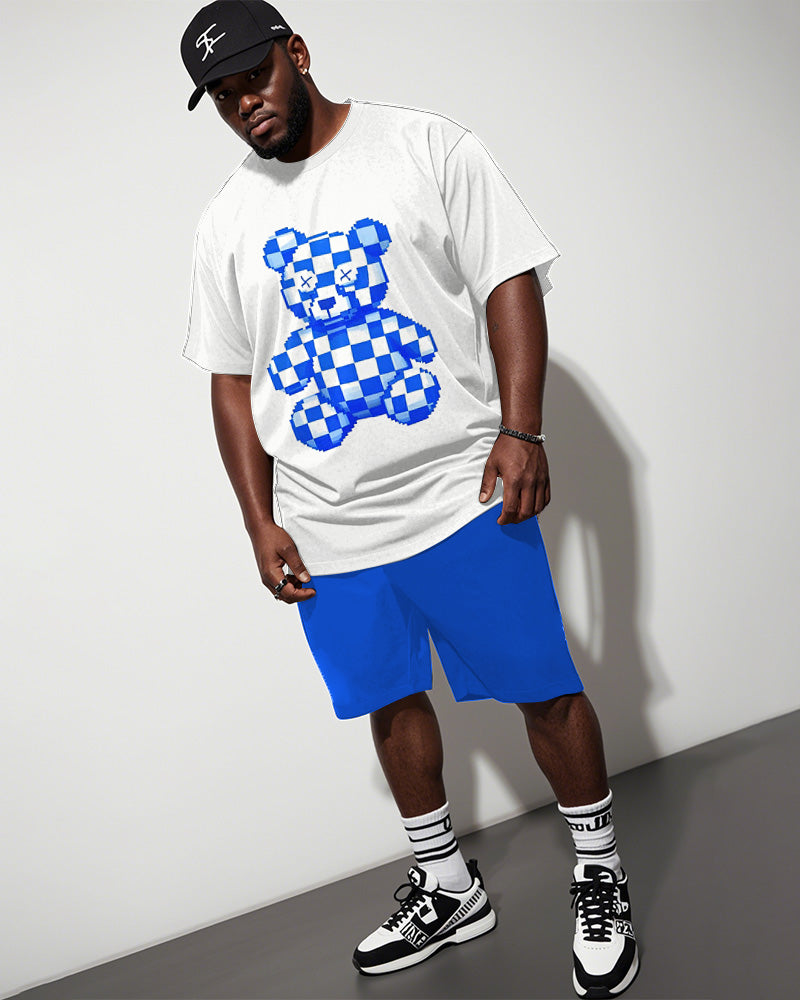 Men's Plus Size Blue Checkerboard Pixel Bear Print Short Sleeve T-Shirt Shorts Suit