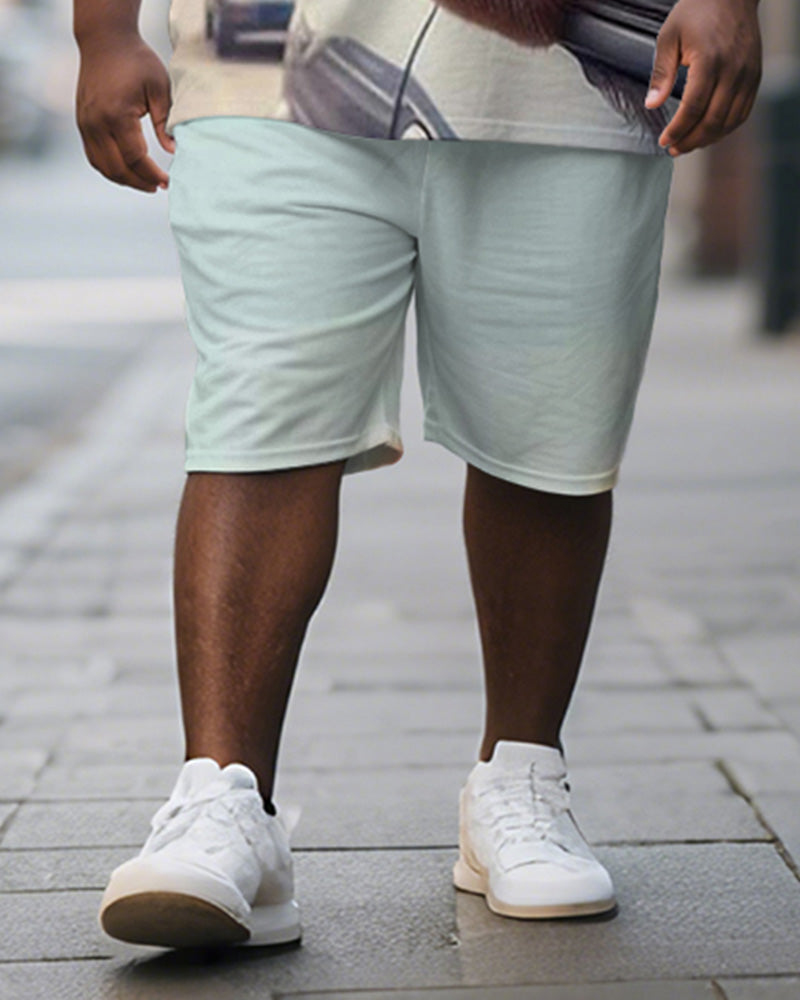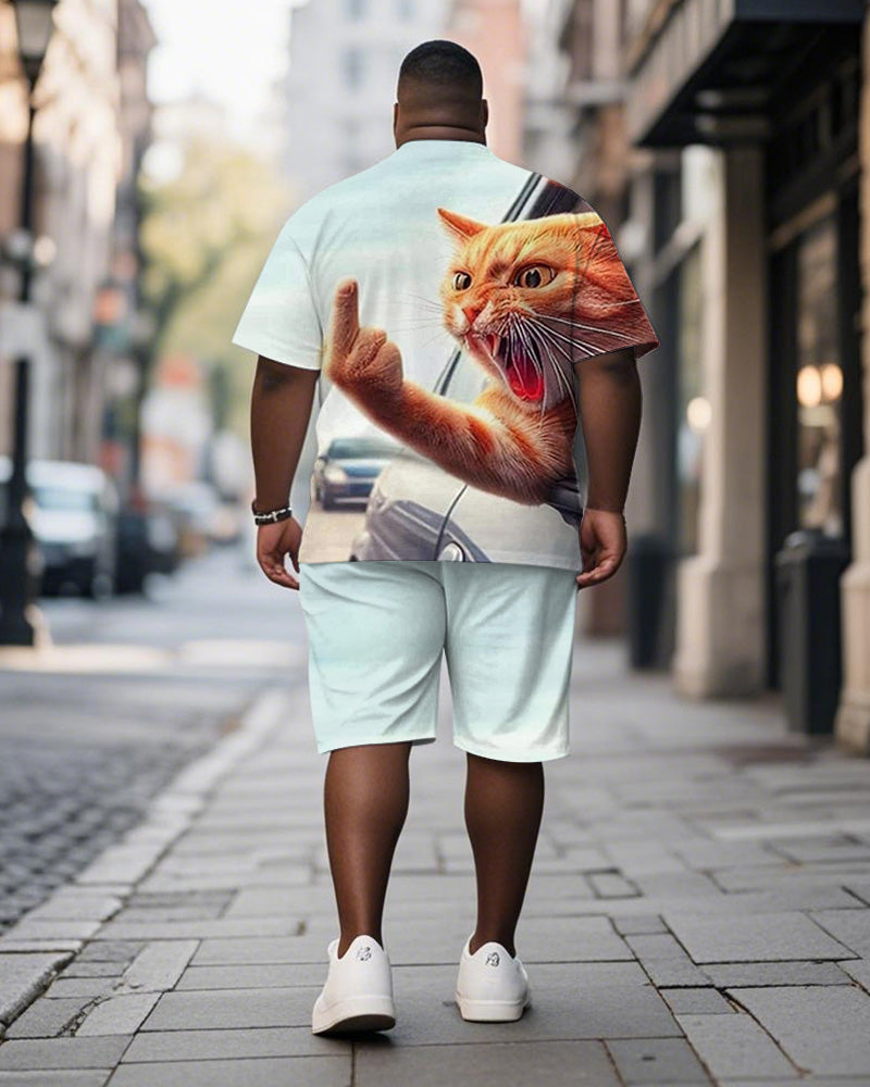 Men's Plus Size Blue Fun Cat Print Short Sleeve T-Shirt Shorts Suit