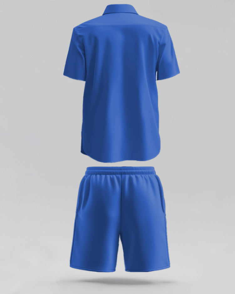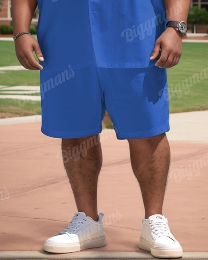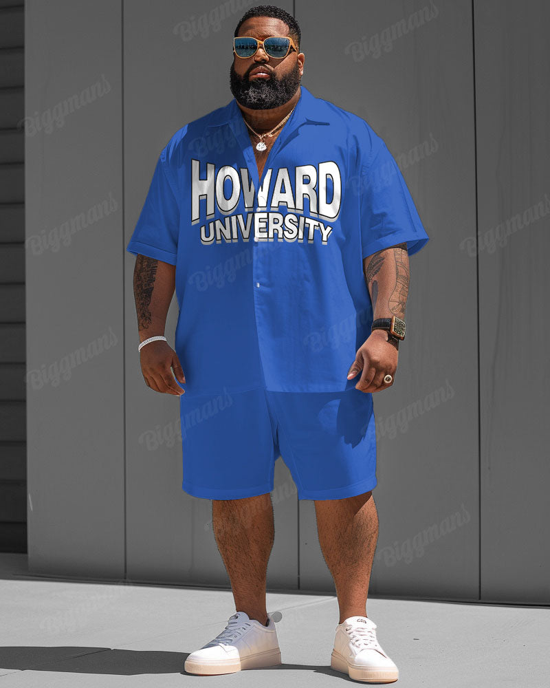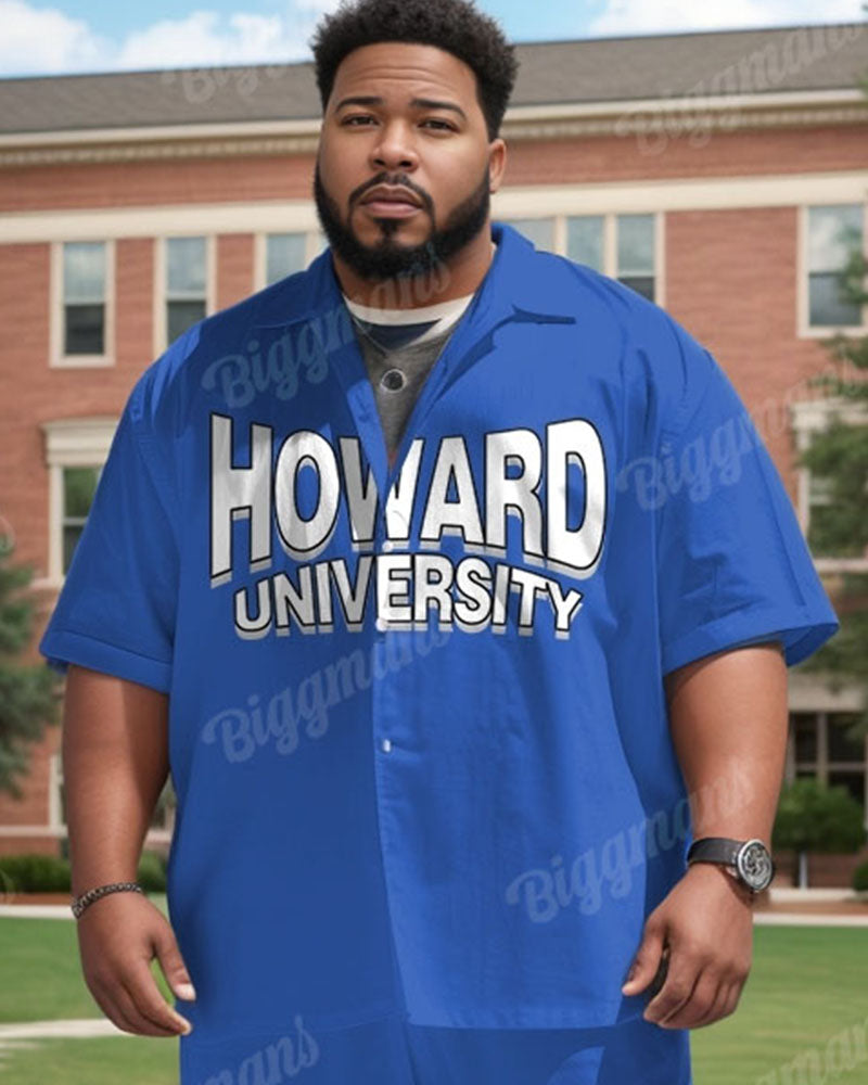 v This men's plus size two-piece set comes in blue color. The shirt may have a classic collar and button layout, emphasizing simplicity. The shorts are designed to fit an enlarged body for comfort and ease. Its integration of Howard University elements, such as the school logo or representative color clever embellishment, show the college style, the overall exudes youthful vitality and campus culture charm.