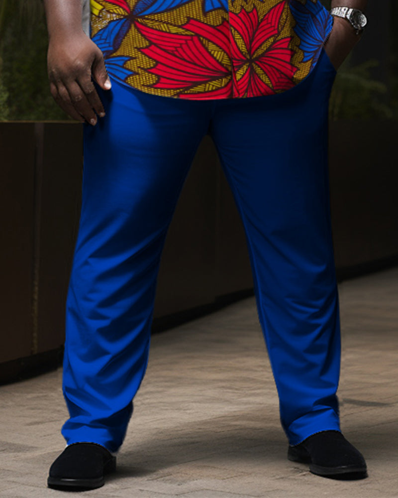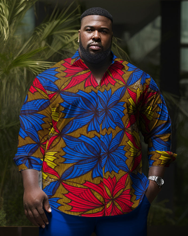 Men's Plus Size Blue Red Color Matching Leaf Long Sleeve Lapel Shirt Two-Piece Set