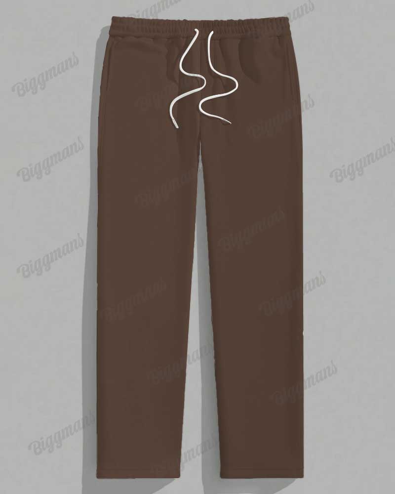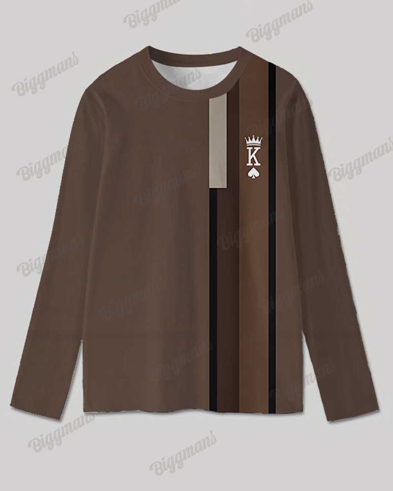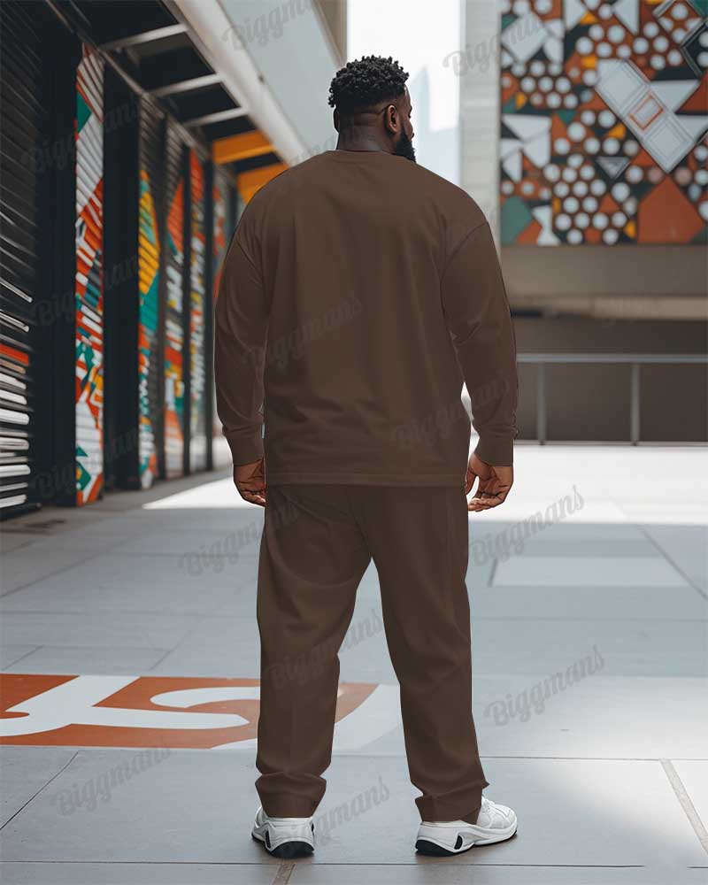 This men's set consists of a long-sleeved T-shirt and pants in a brown color with a striped design for a layered look and a monogrammed print for a stylish touch. The oversized design is suitable for larger sizes. The pants match the style of the t-shirt, giving the set a casual and airy look that's perfect for everyday wear.
