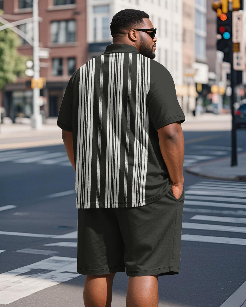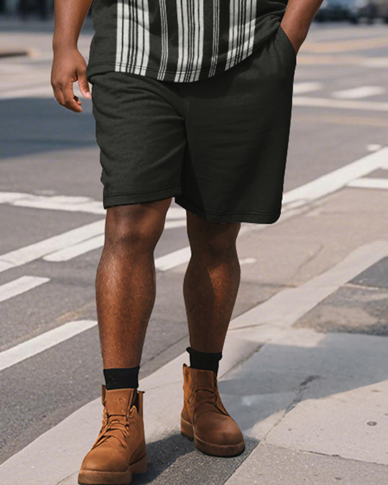 Men's Plus Size Business Black Stripe Print Short Sleeve Polo Shirt Shorts Suit