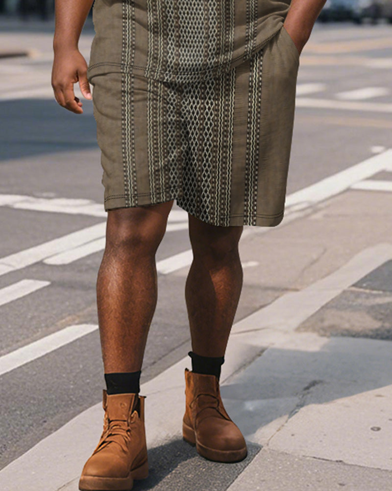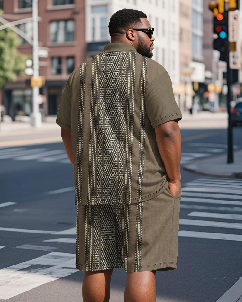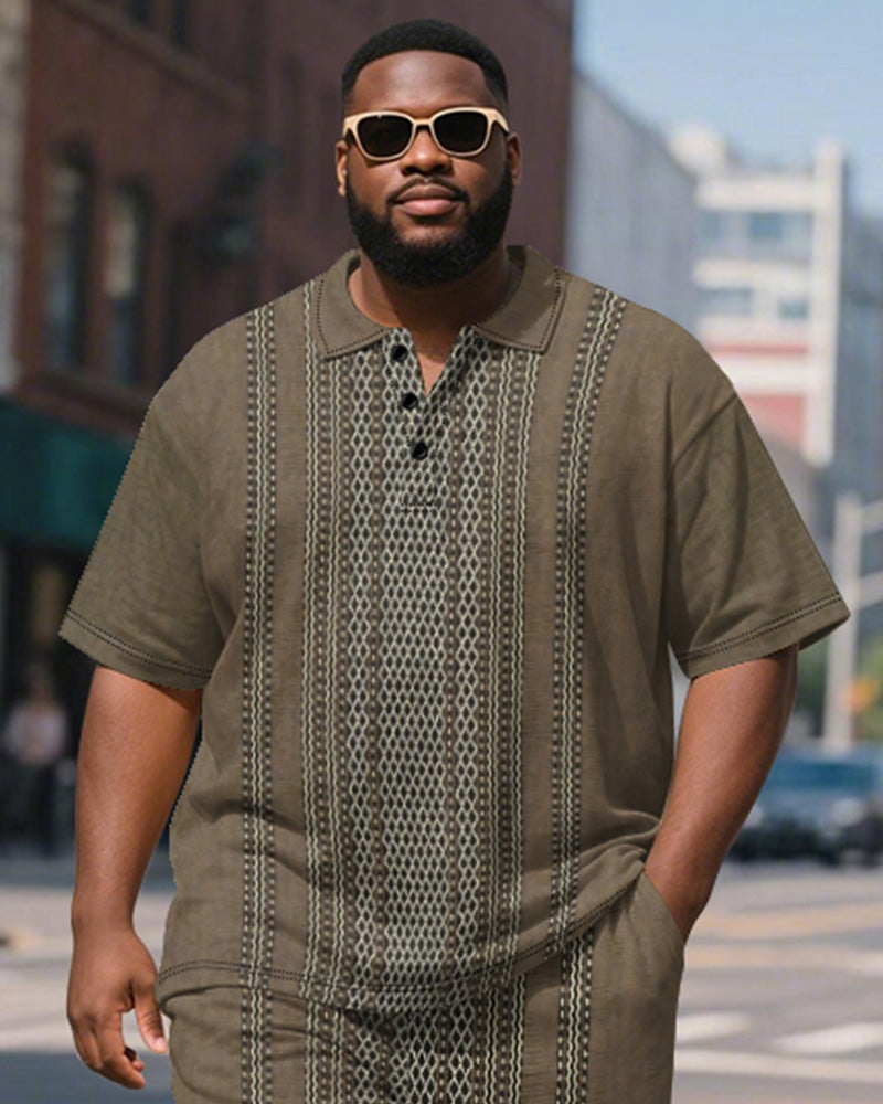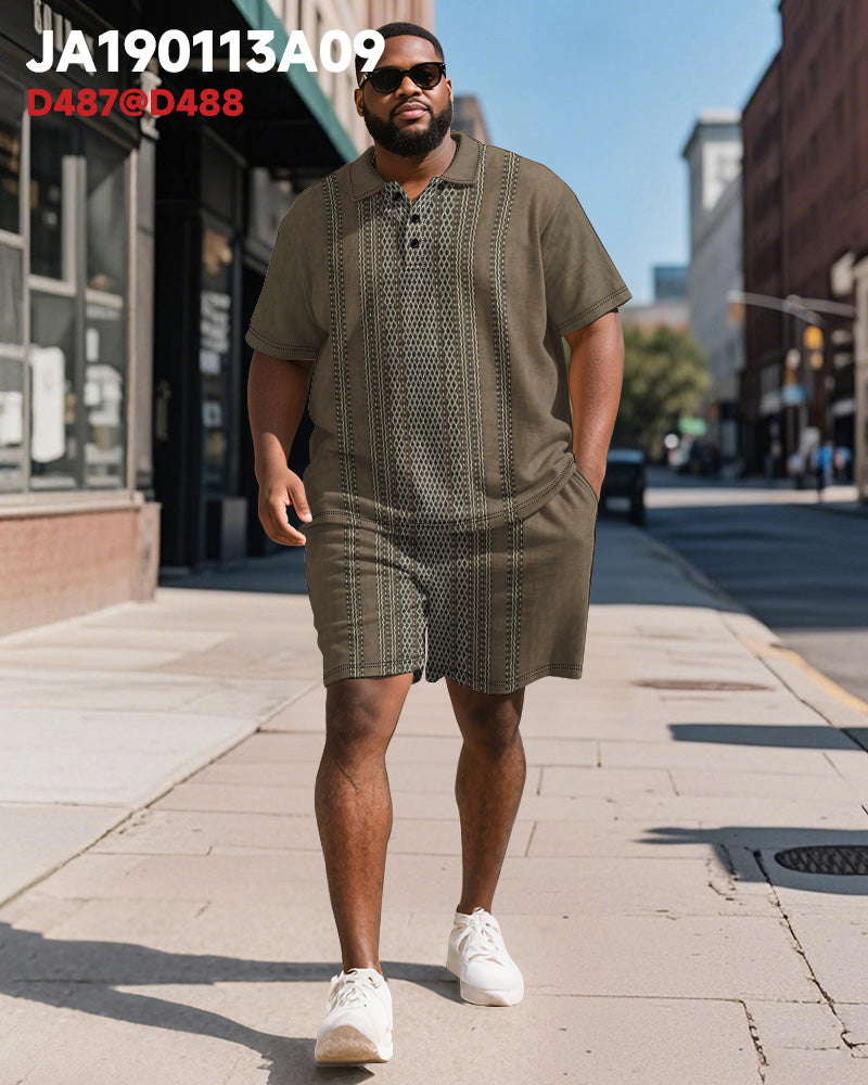 Men's Plus Size Business Brown Striped Print Short Sleeve Polo Shirt Shorts Suit