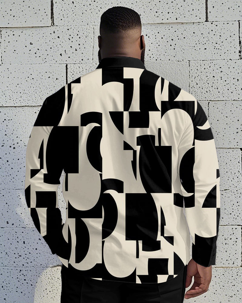 Men's Plus Size Business Khaki Color Block Geometric Print Long Sleeve Shirt
