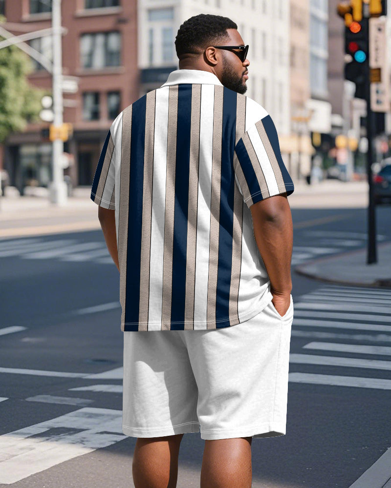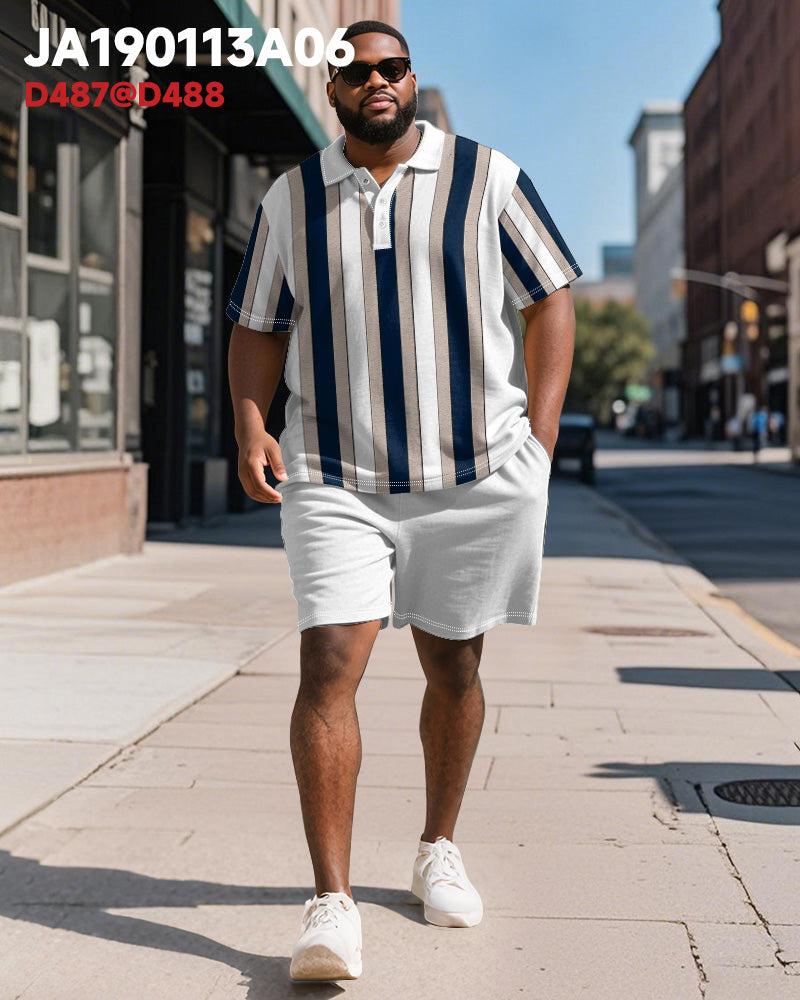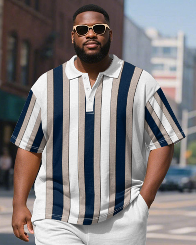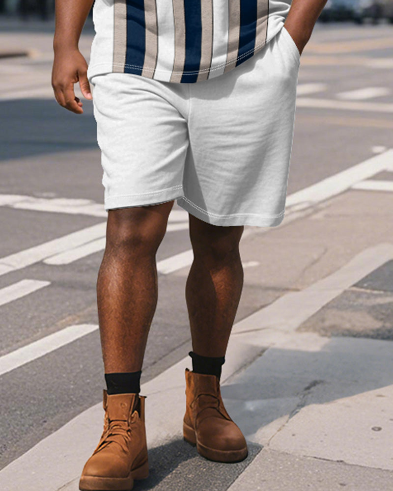 Men's Plus Size Business White Blue Stripe Print Short Sleeve Polo Shirt Shorts Suit