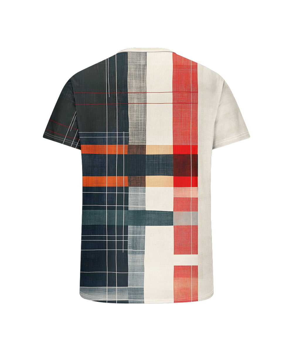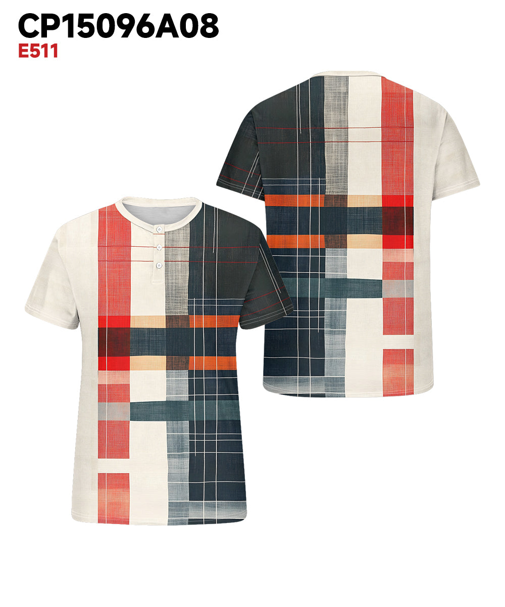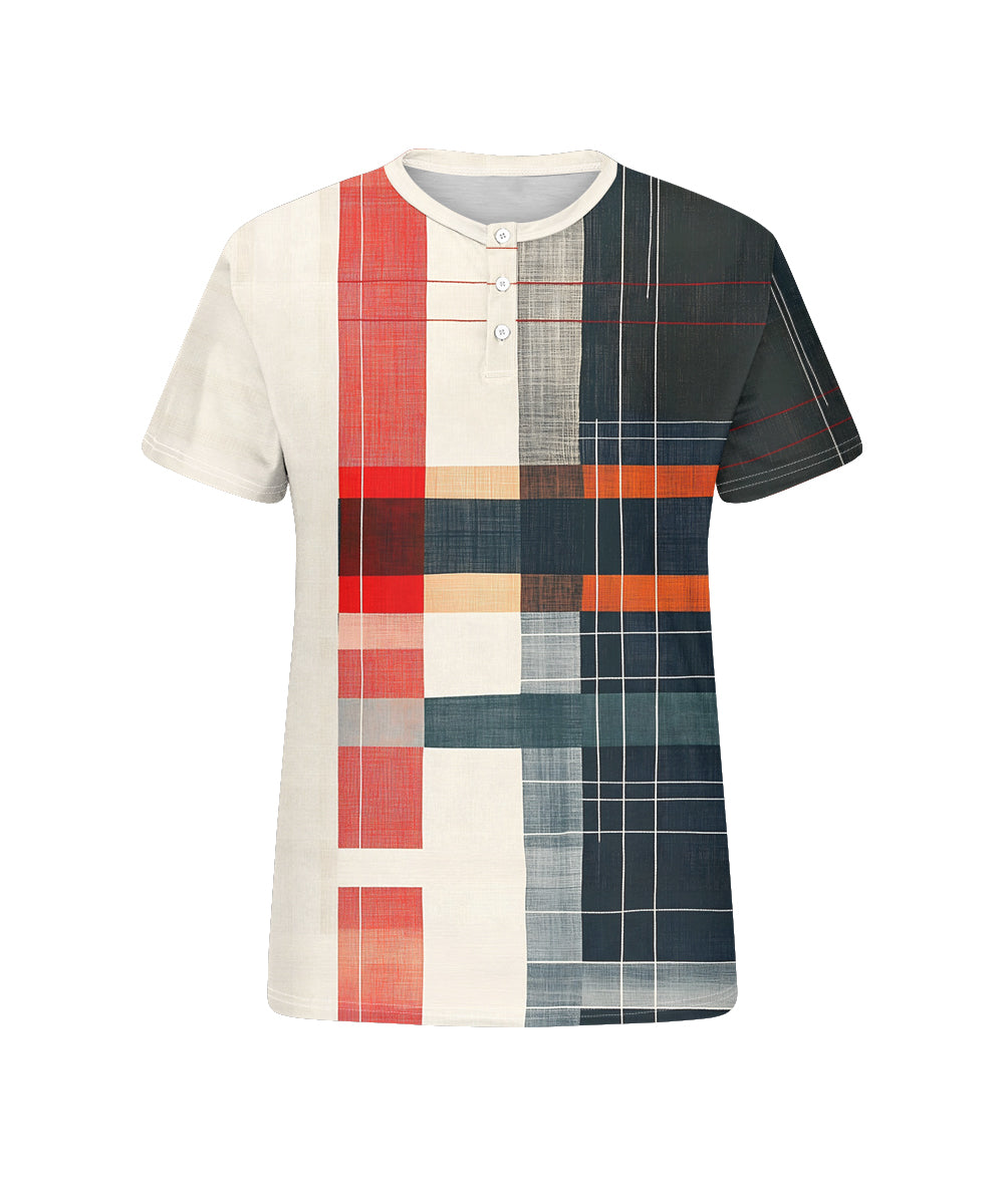 Men's Plus Size Casual Black And Red Geometric Plaid Print Henry Collar Button Short Sleeve T-Shirt
