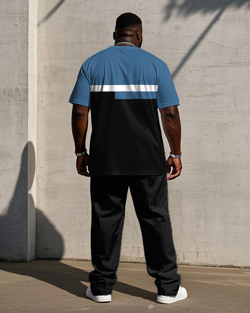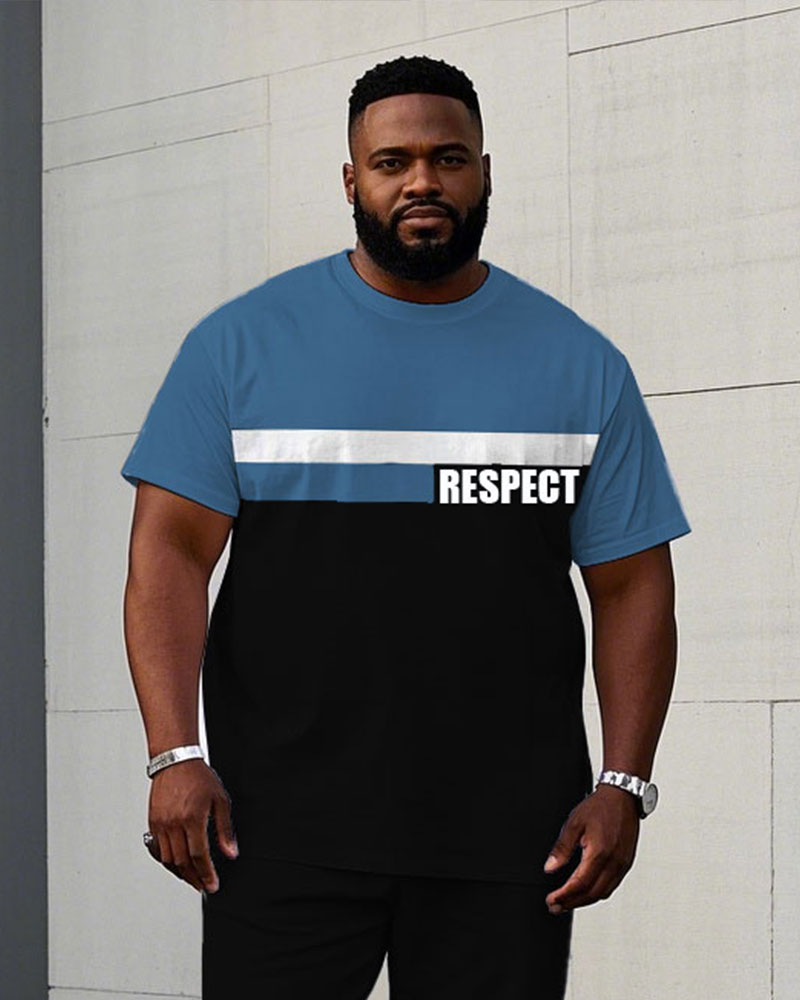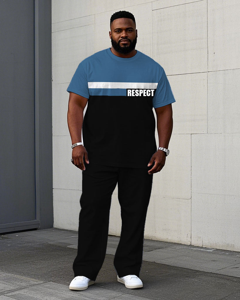 Men's Plus Size Casual Black & Blue "Respect" Slogan Chest Print Short Sleeve T-Shirt Trousers Suit