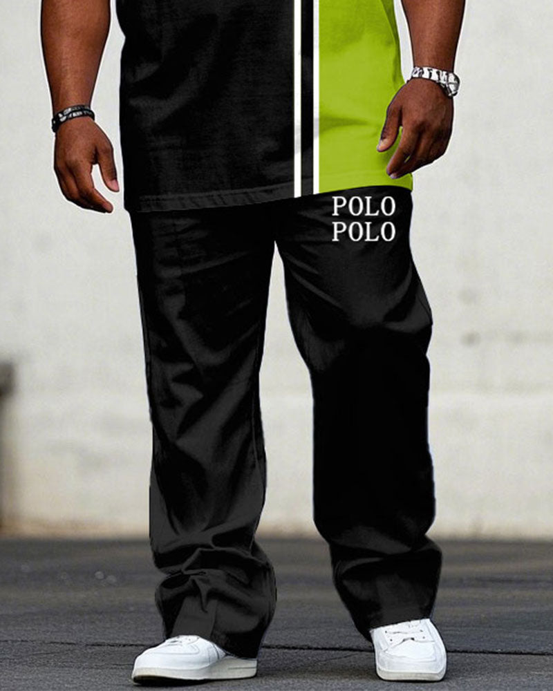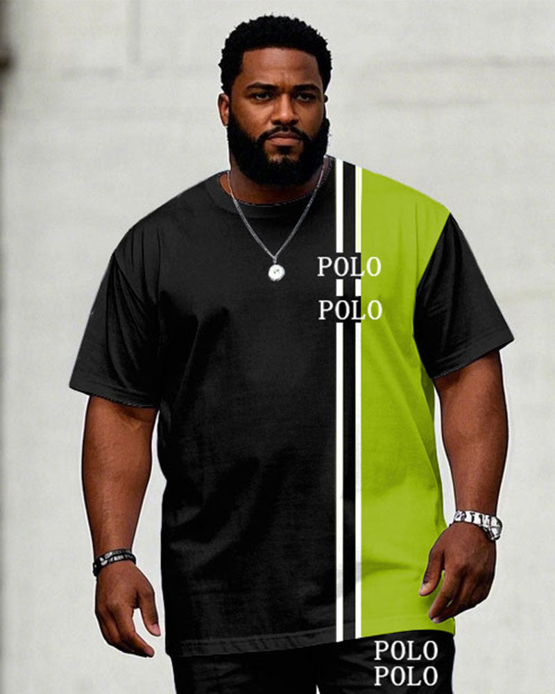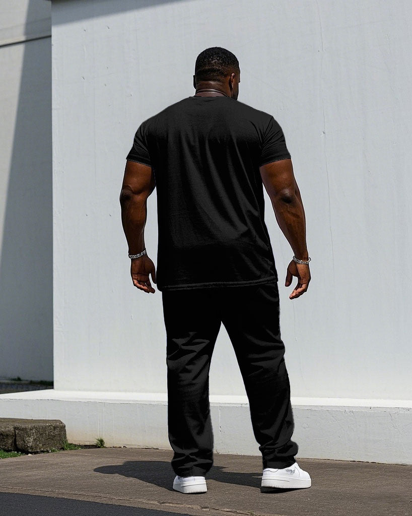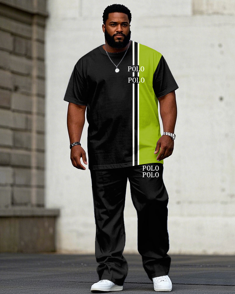 Men's Plus Size Casual Black & Green Chest Design Small Label Printed Short Sleeve T-Shirt Trousers Suit