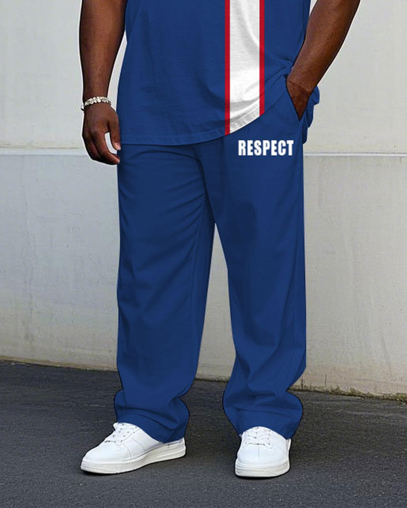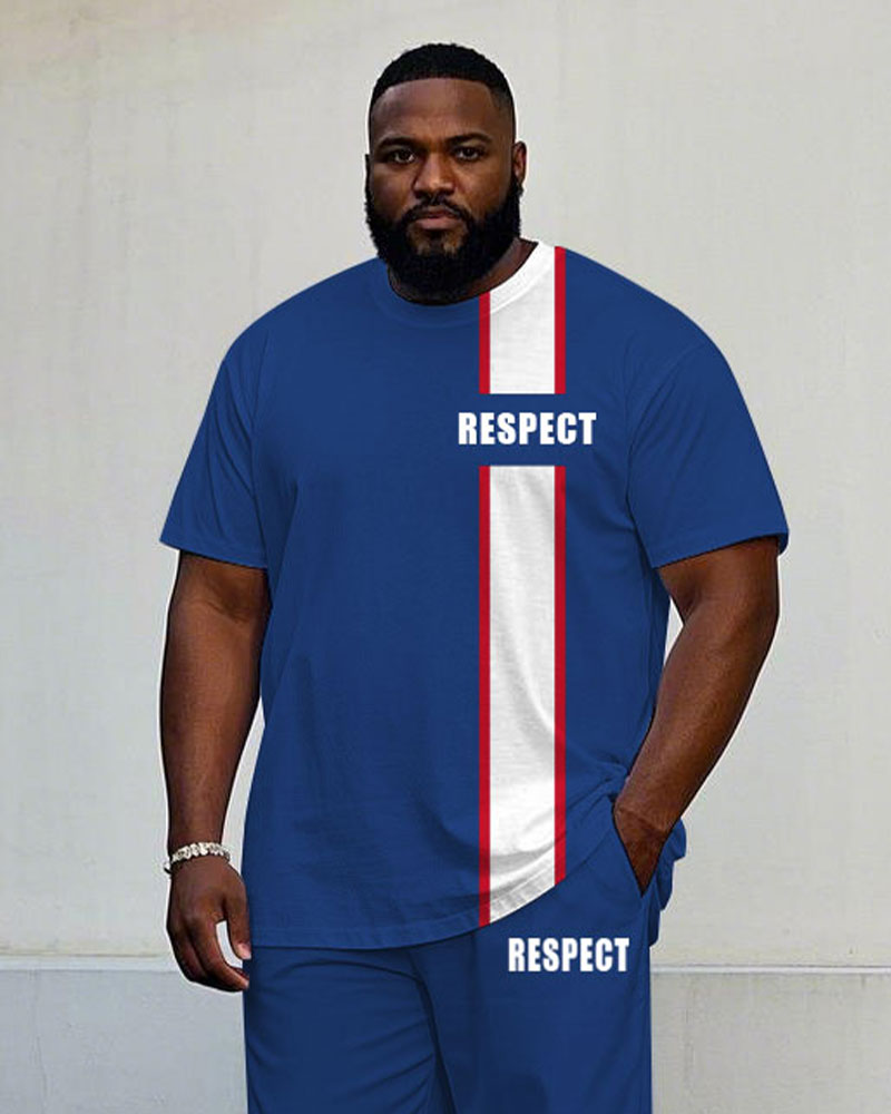 Men's Plus Size Casual Blue & White Colorblock Small Label Printed Short-sleeved T-shirt Trousers Suit
