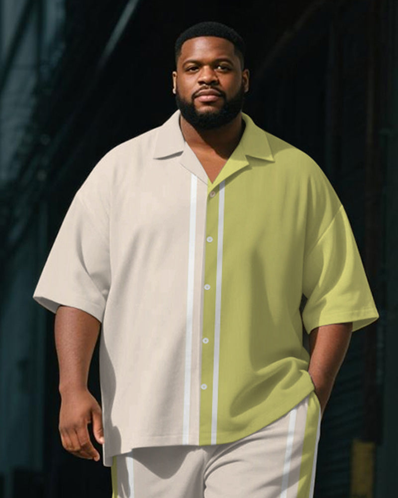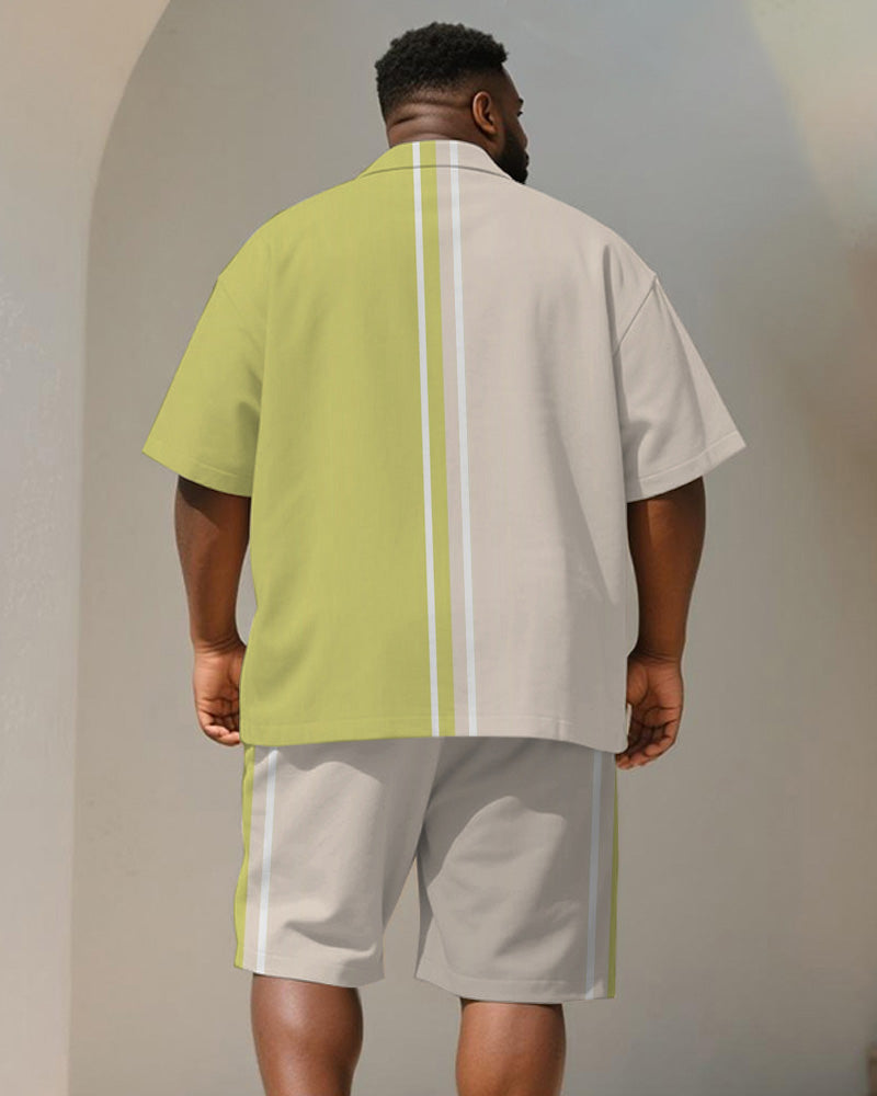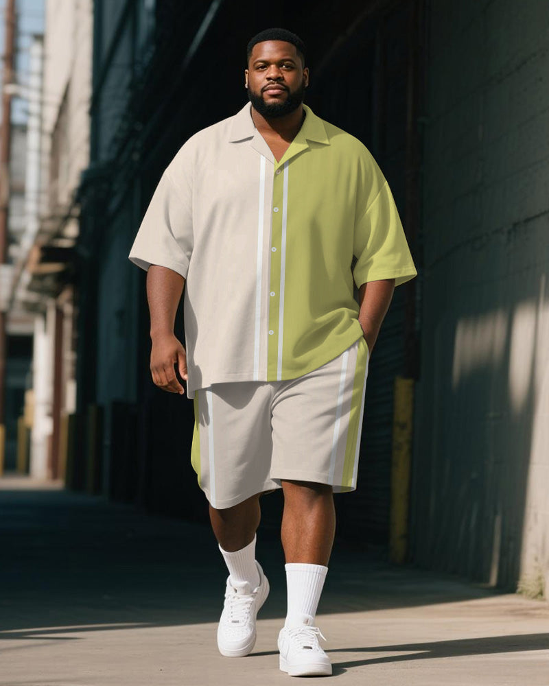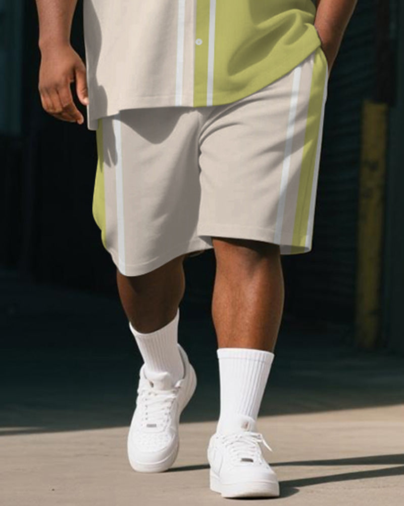 Men's Plus Size Casual Business Apricot Spelling Green Striped Printed Shirt Shorts Suit