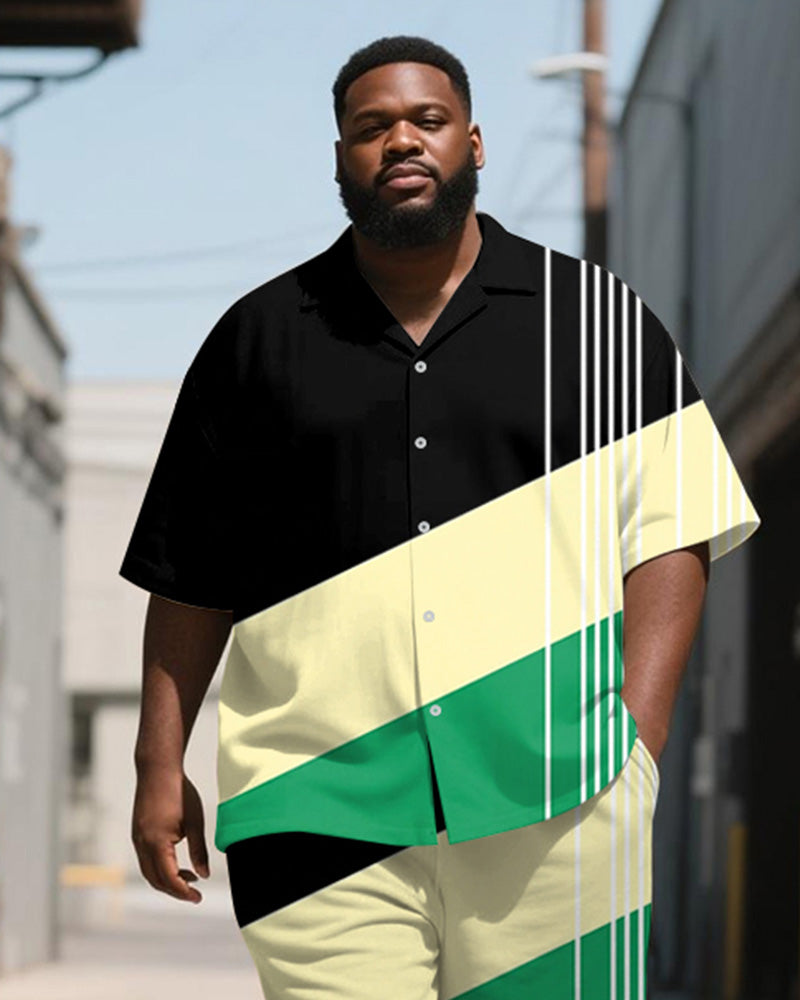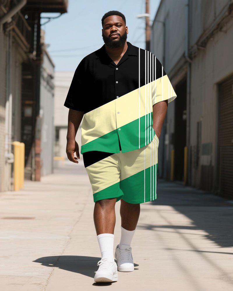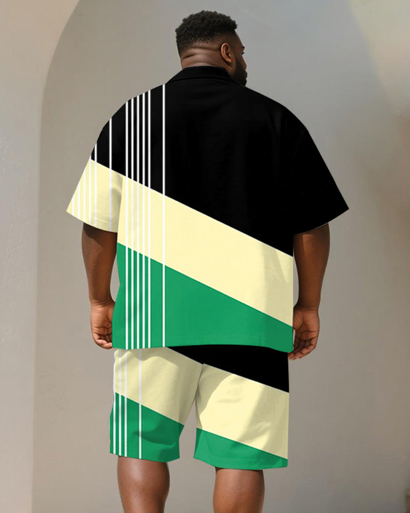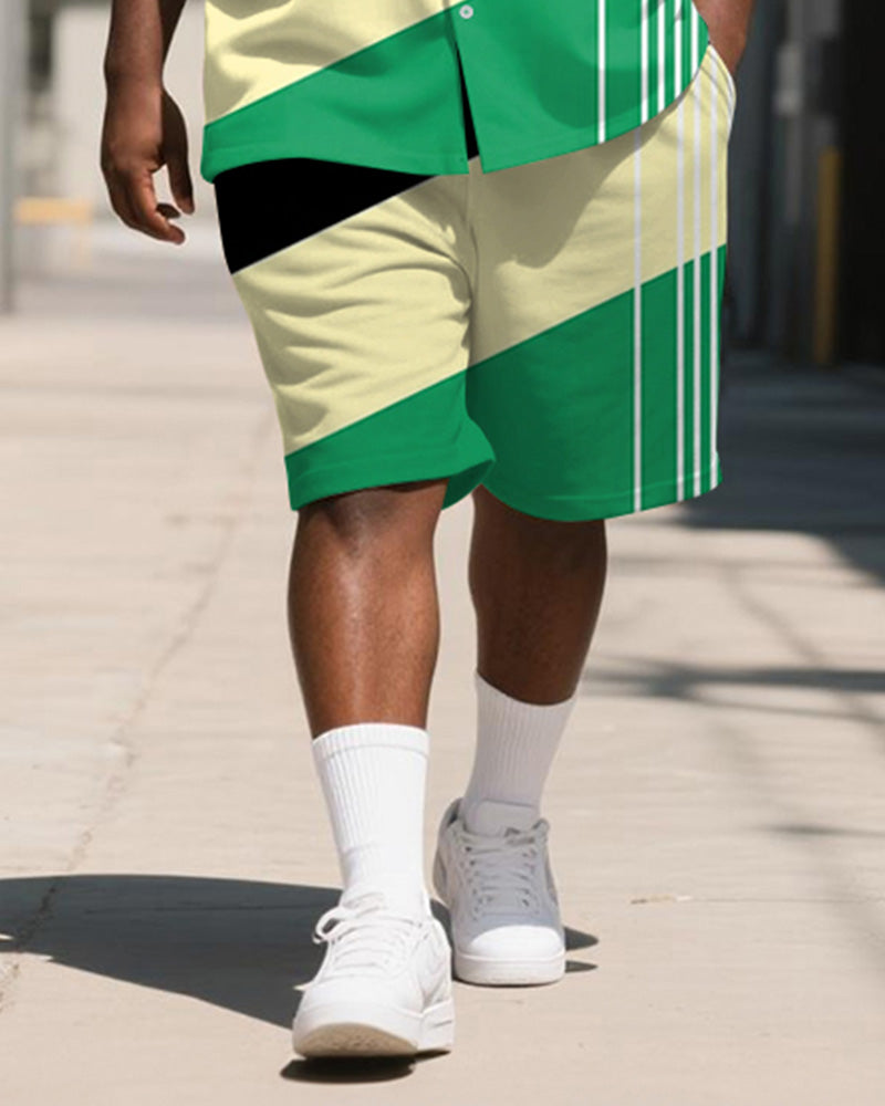 Men's Plus Size Casual Business Black Green Geometric Striped Print Shirt Shorts Suit