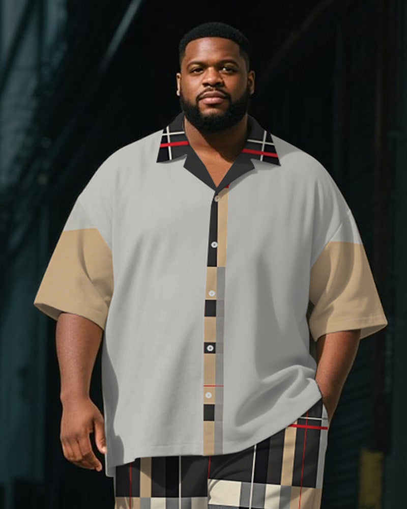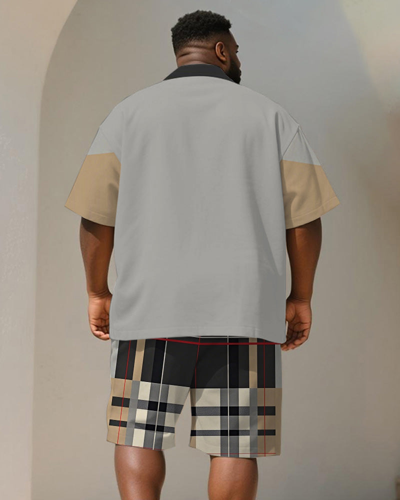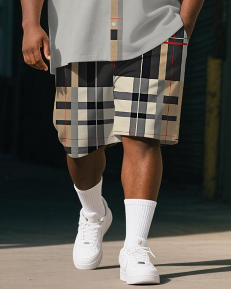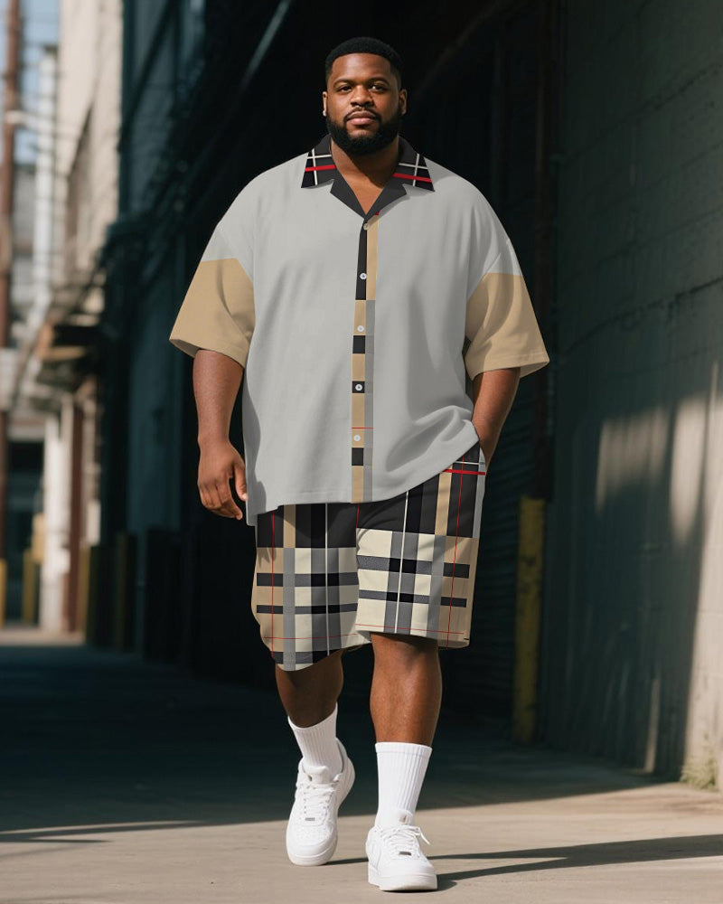 Men's Plus Size Casual Business Black Khaki Plaid Letter Print Shirt Shorts Suit