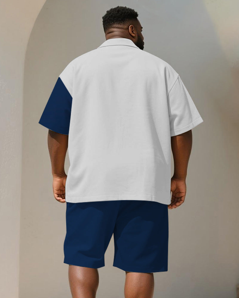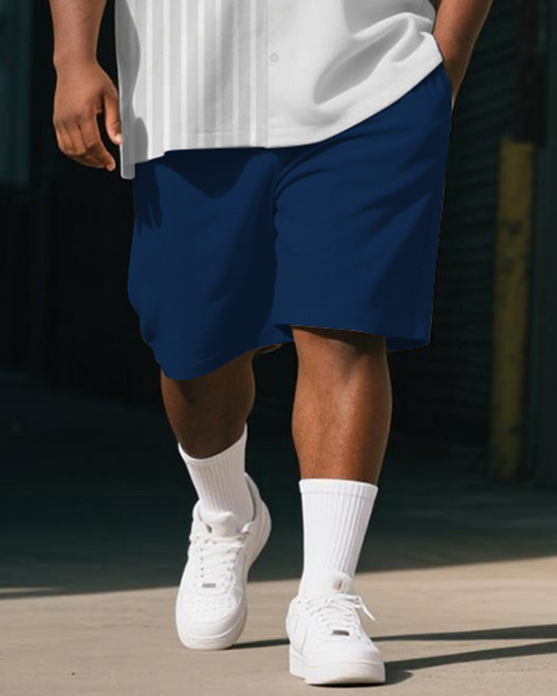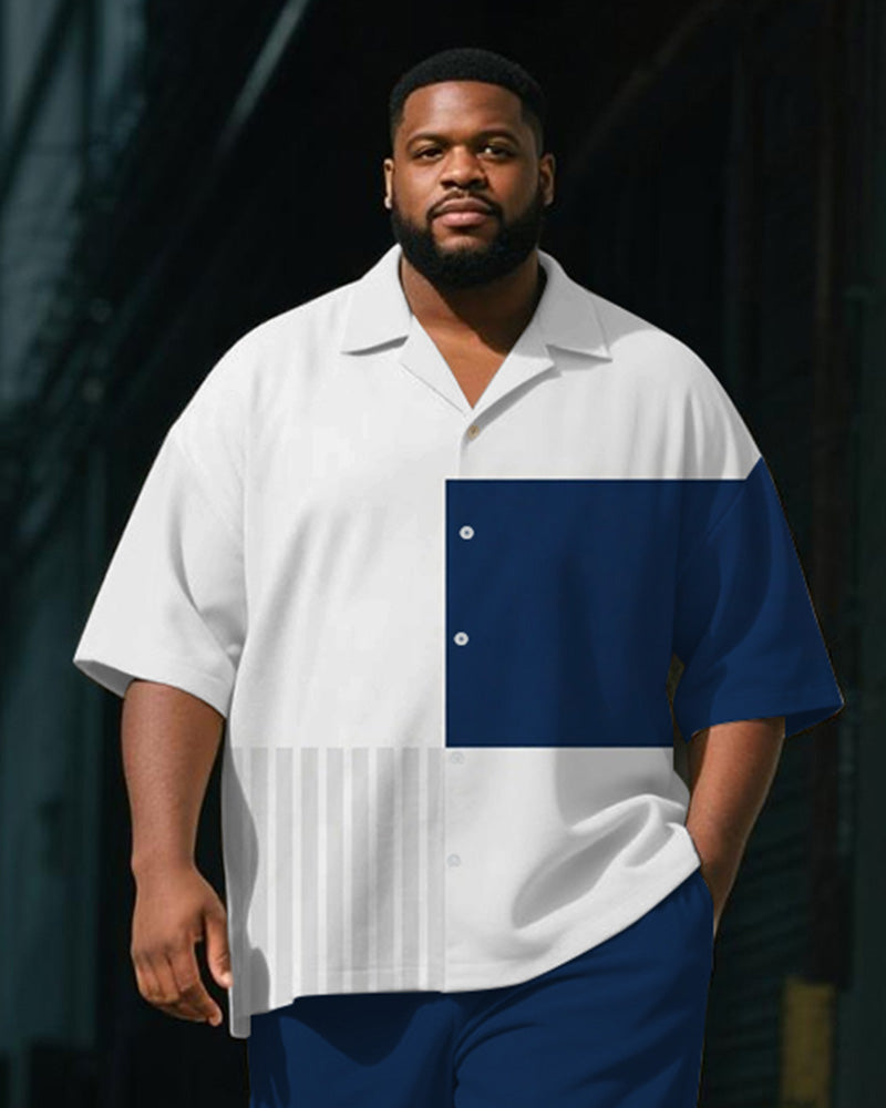 Men's Plus Size Casual Business Blue Geometric Stripe Alphabet Print Shirt Shorts Suit
