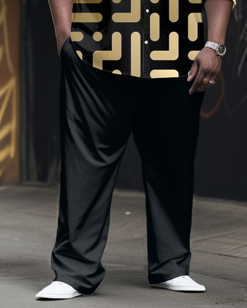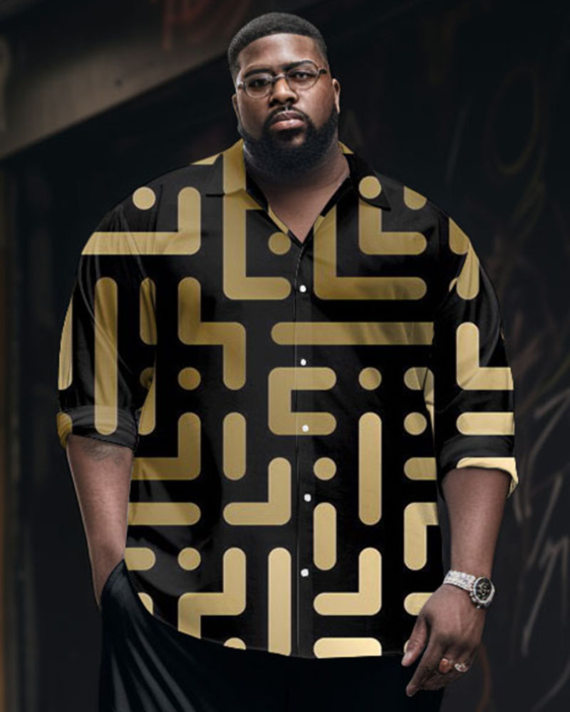 Make a statement with the Big & Tall Men's Long Sleeve Shirt and Pants Set. This stylish set features vibrant yellow geometric patterns on a black shirt, paired with comfortable, tailored pants. Perfect for both business and casual occasions, it offers a sleek, modern look.