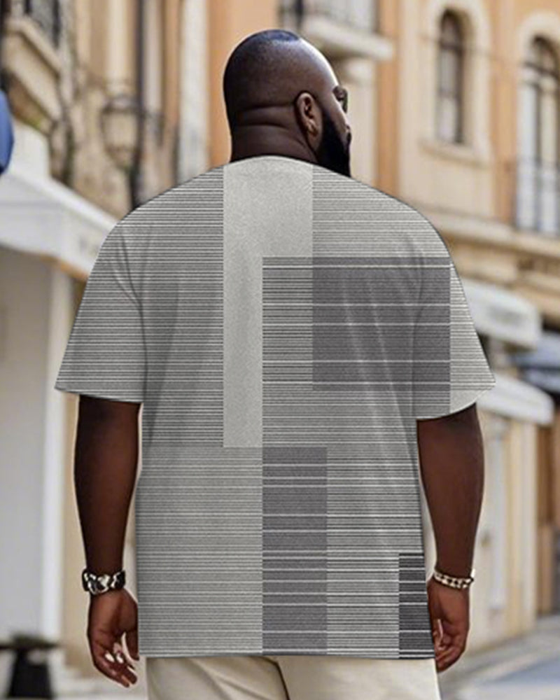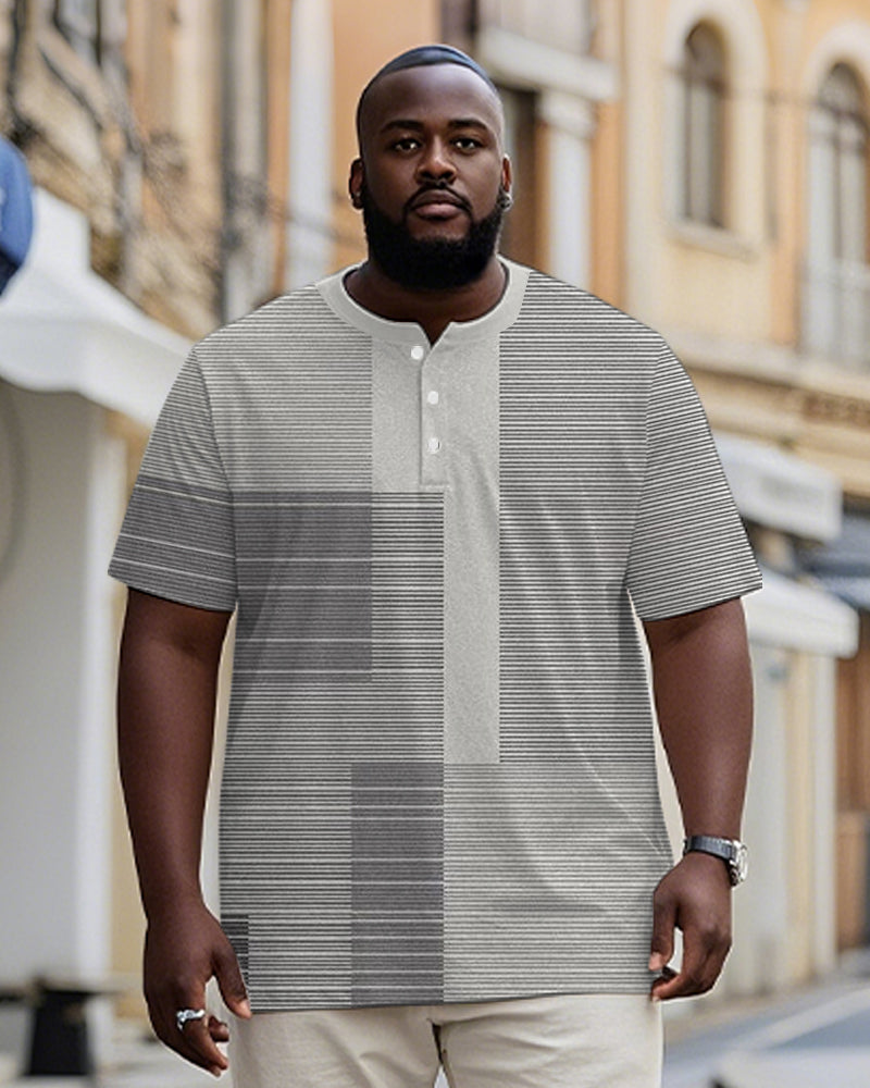 Men's Plus Size Casual Daily Grey Contrast Striped Print Henley Collar Button Short Sleeve T-Shirt