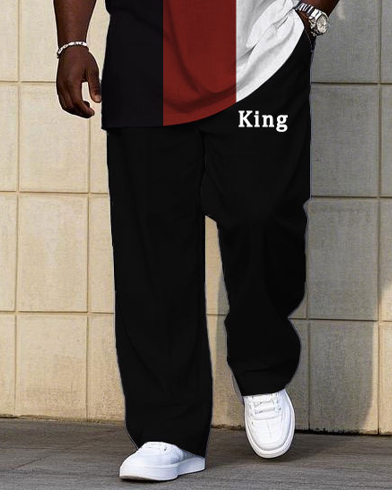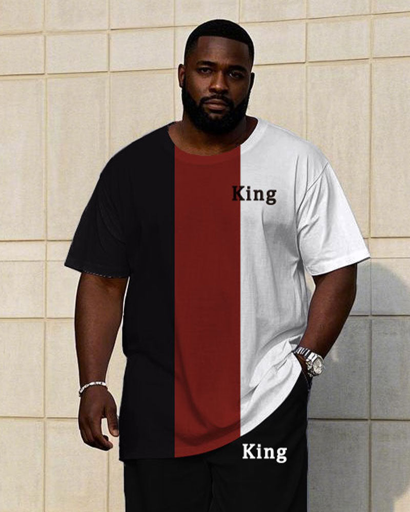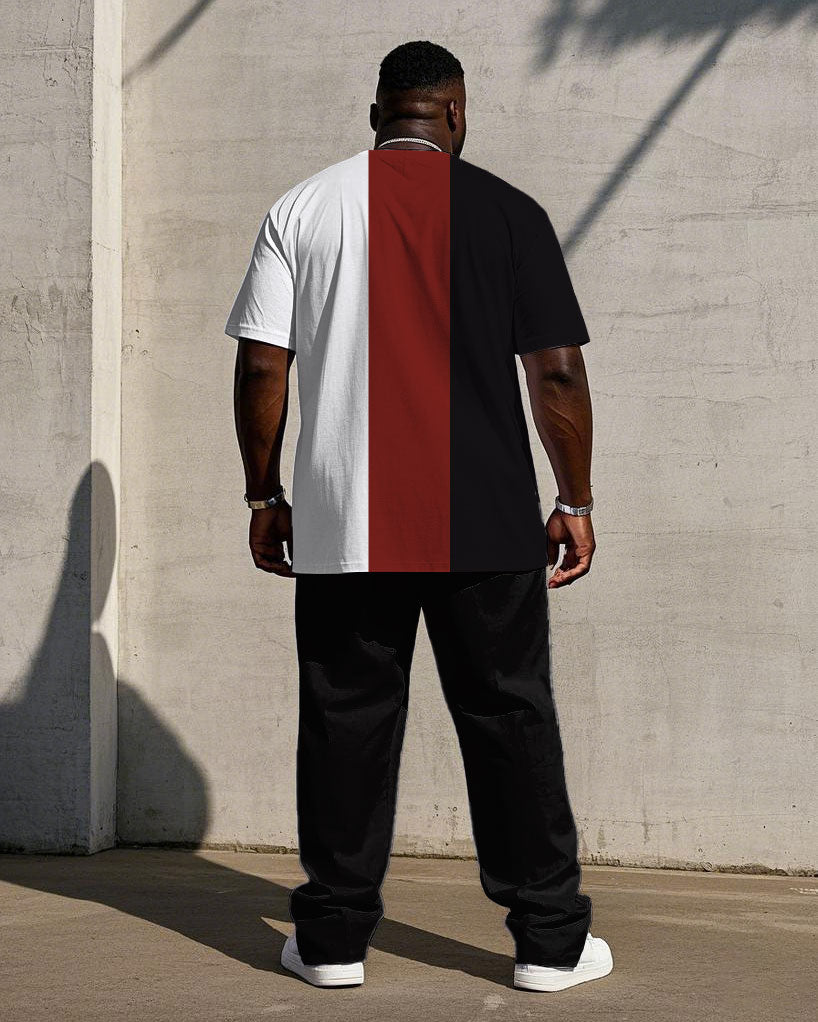 Men's Plus Size Casual Fashion Red & Black & White Thick Stripe Color-matching Chest Small Label Printed Short-sleeved T-shirt Trousers Suit