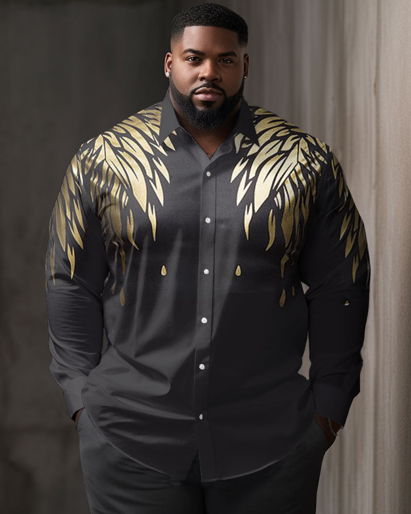 Golden wings, romantic and grand. This black shirt for big guys is a standout piece that combines elegance with romance. The unique gold feather wing print on the shoulders evokes the embrace of angelic wings. Tailored with a fitted cut, this shirt enhances your silhouette. It’s versatile enough to wear wherever you go.