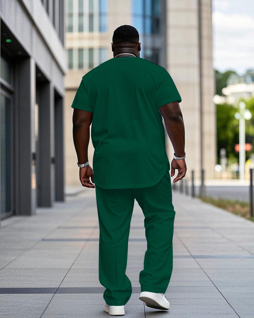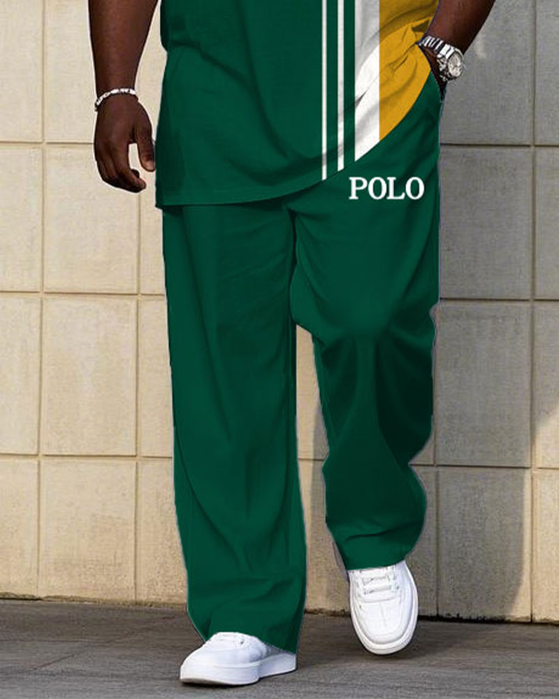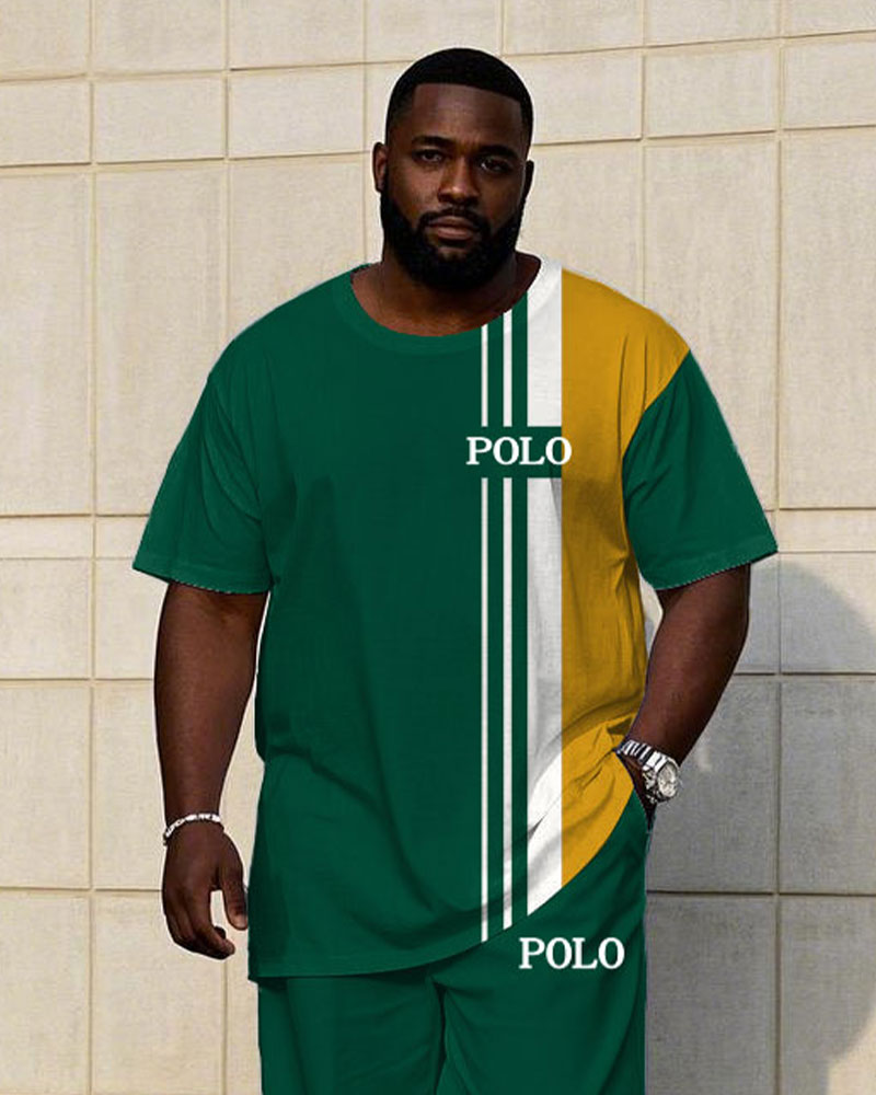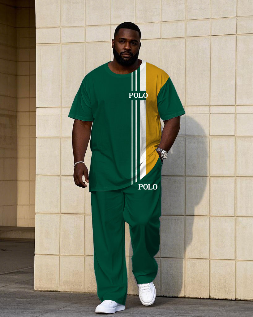 Men's Plus Size Casual Green & Yellow Color-block Small Label Printed Short-sleeved T-shirt Trousers Suit