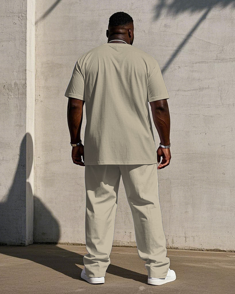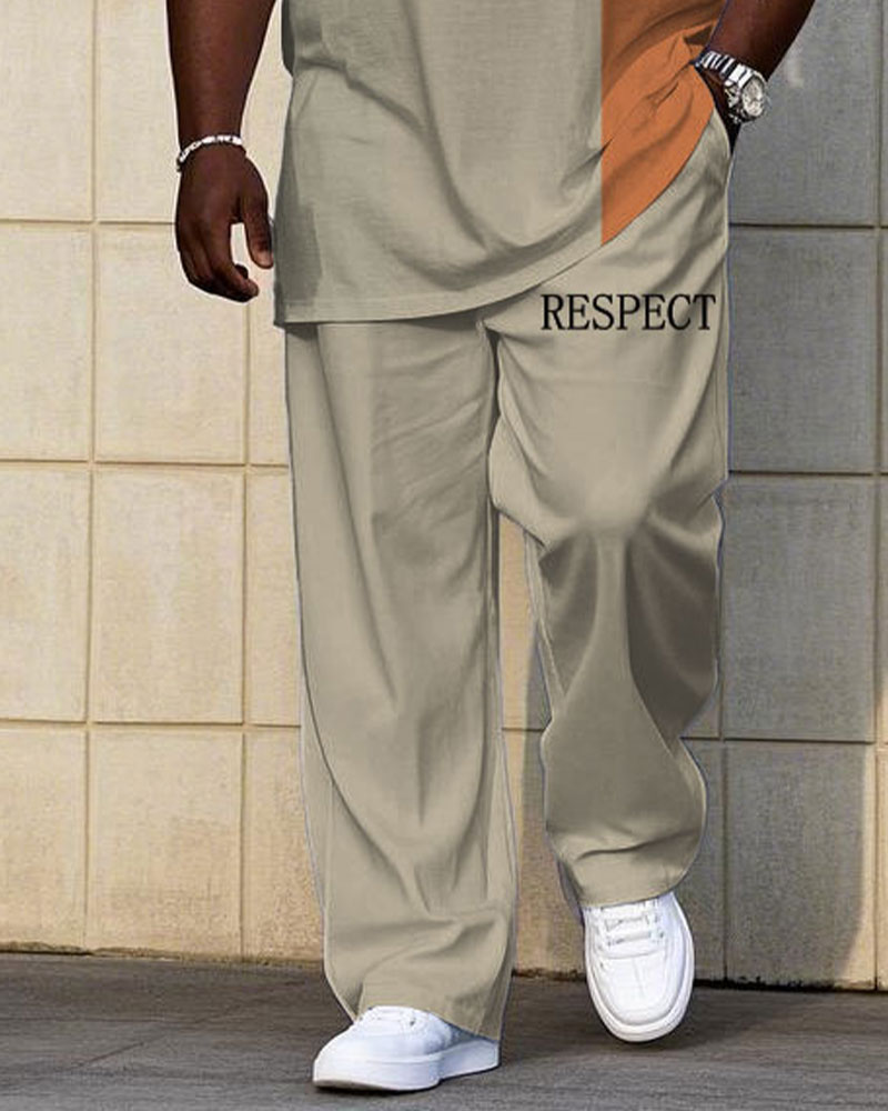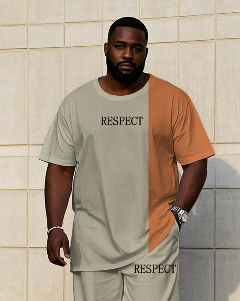 Men's Plus Size Casual Khaki & Test Colorblock "Respect" Chest Print Short Sleeve T-Shirt Trousers Suit