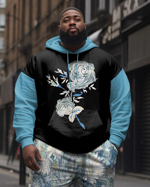 This men’s two-piece set is a go-to for looking sharp without trying hard! It features a cool black hoodie with rose prints and blue color-blocked sleeves. The matching blue floral print pants make it a complete look that’s both stylish and easy to wear. Made from high-quality fabric, it’s super comfy and perfect for any occasion.