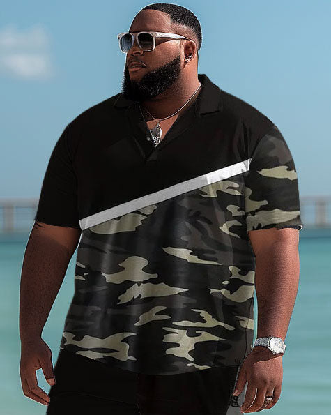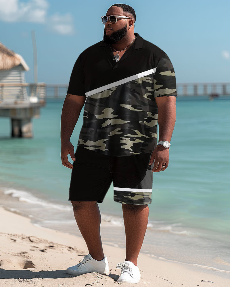 This big guy's shorts set combines camouflage style with color block design, showing a modern sense. Combining classic elements with white lines, it is stylish and stunning. It provides multiple size options, suitable for all men. It is a go-to set in the modern man's wardrobe.