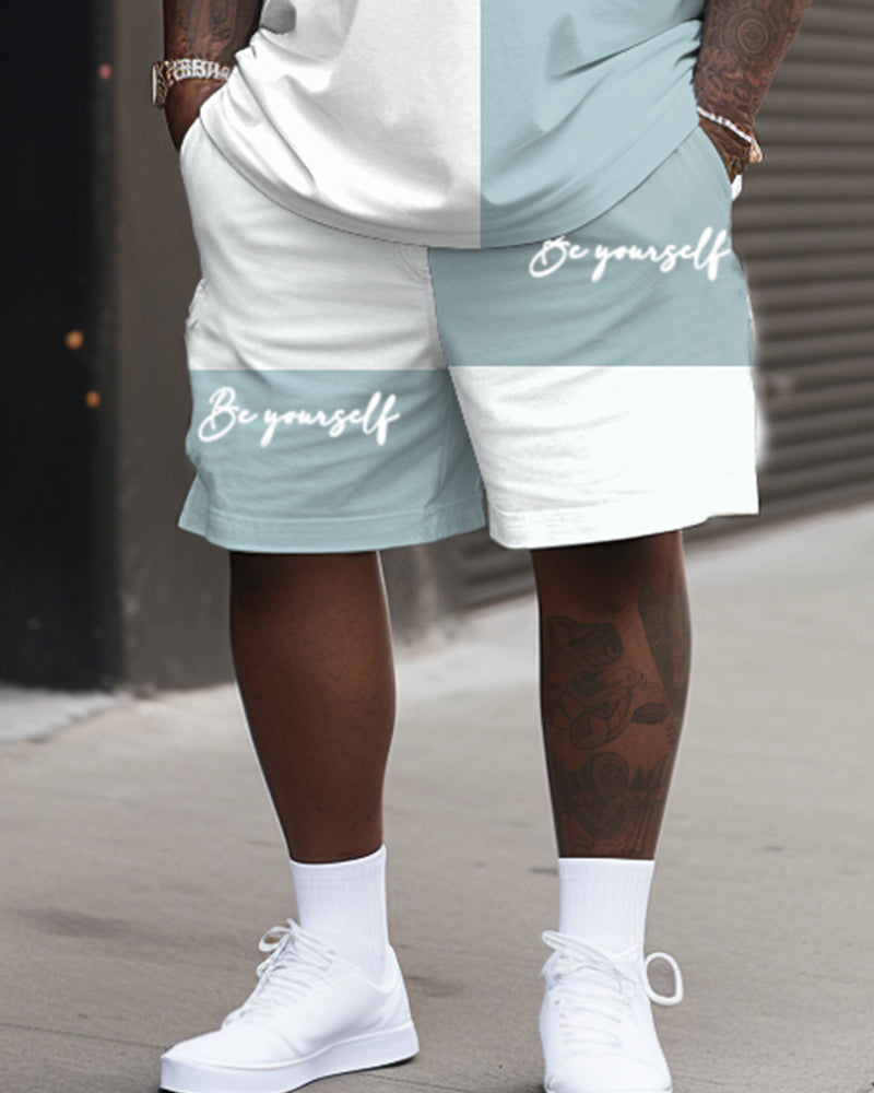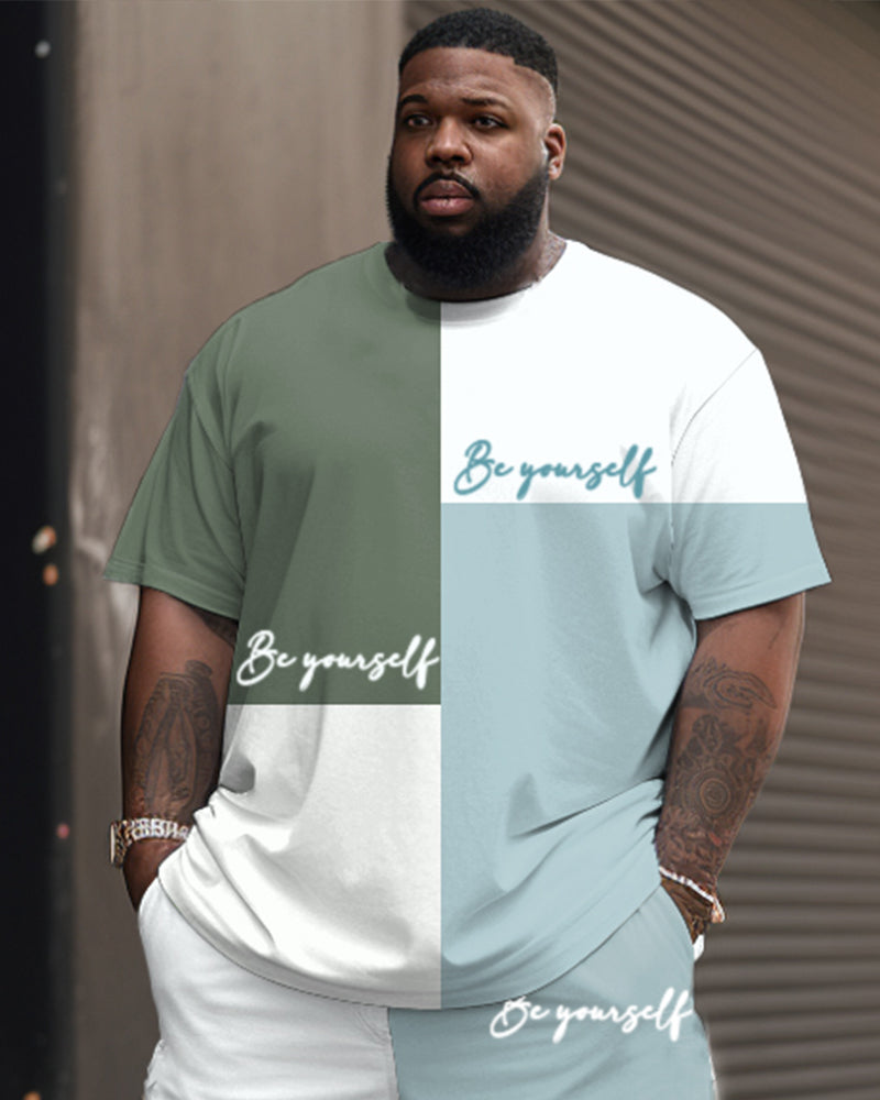 Designed with a splicing style, this men’s short-sleeved T-shirt and shorts set features a dynamic color-block design in vibrant green, blue, and white. The artistic lettering print adds a unique touch, making this outfit a standout choice for any casual occasion. Its versatile design ensures you stay stylish and relaxed all summer long.